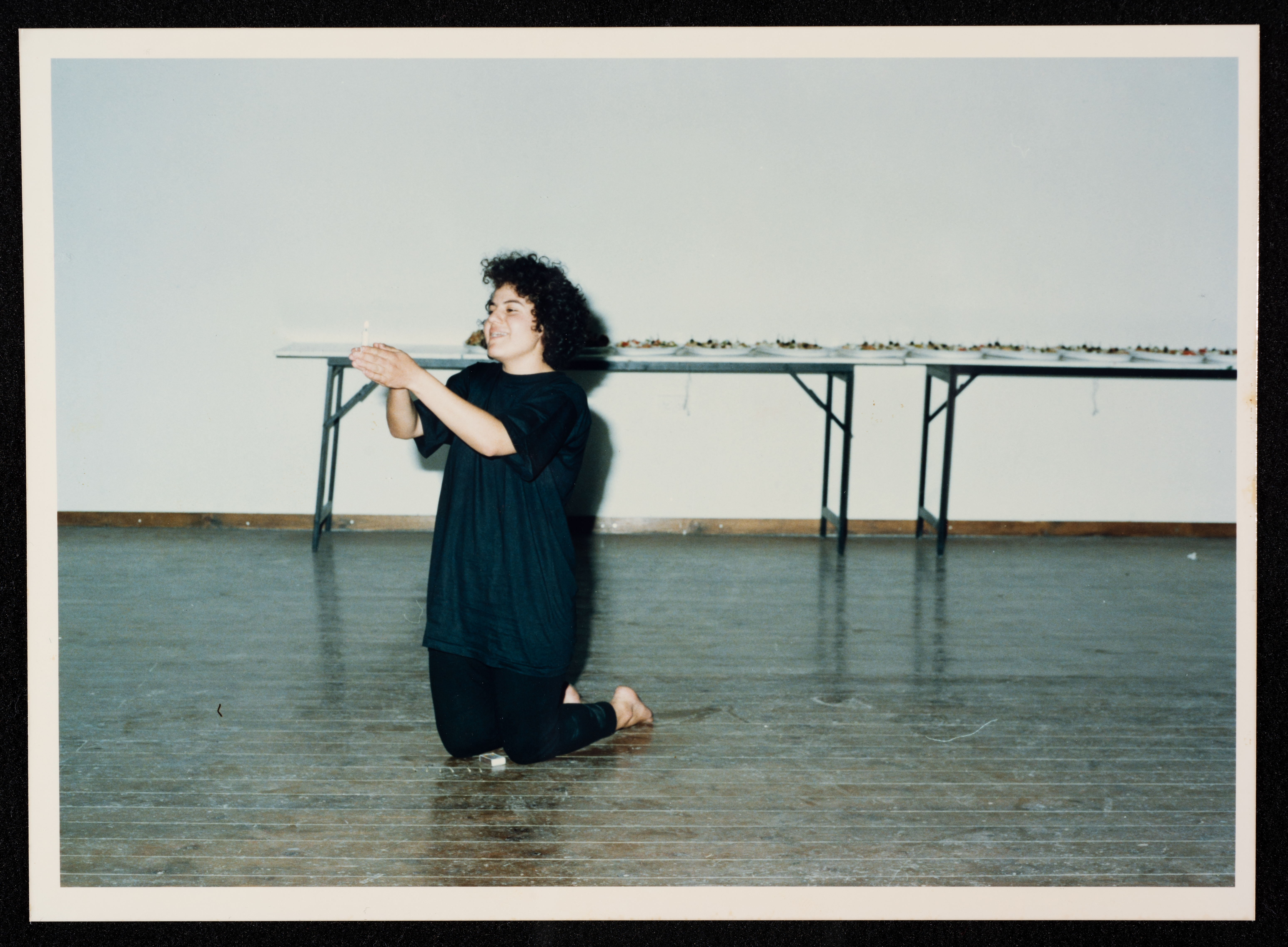 Taken in 1998, this colour photograph captures a glimpse of a workshop for people with disabilities. Held by the Palestinian National Theatre- al-Hakawati, the workshop featured a group of artists.