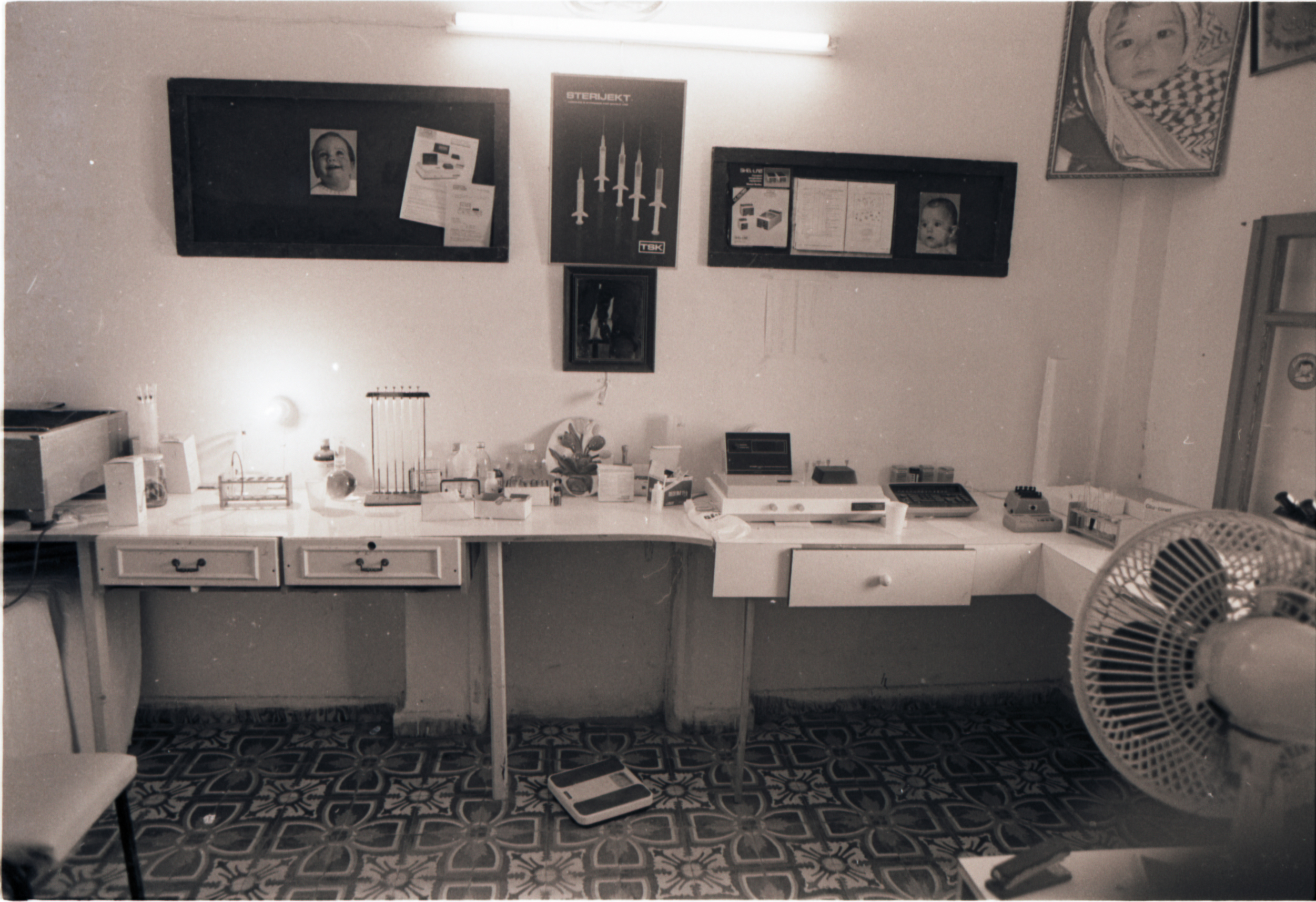 صورة غير ملونة، يظهر فيها عيادة دكتور أطفال في بلدة بيت ساحور عام 1989. وجدت في مجموعة الصحفي دانيال