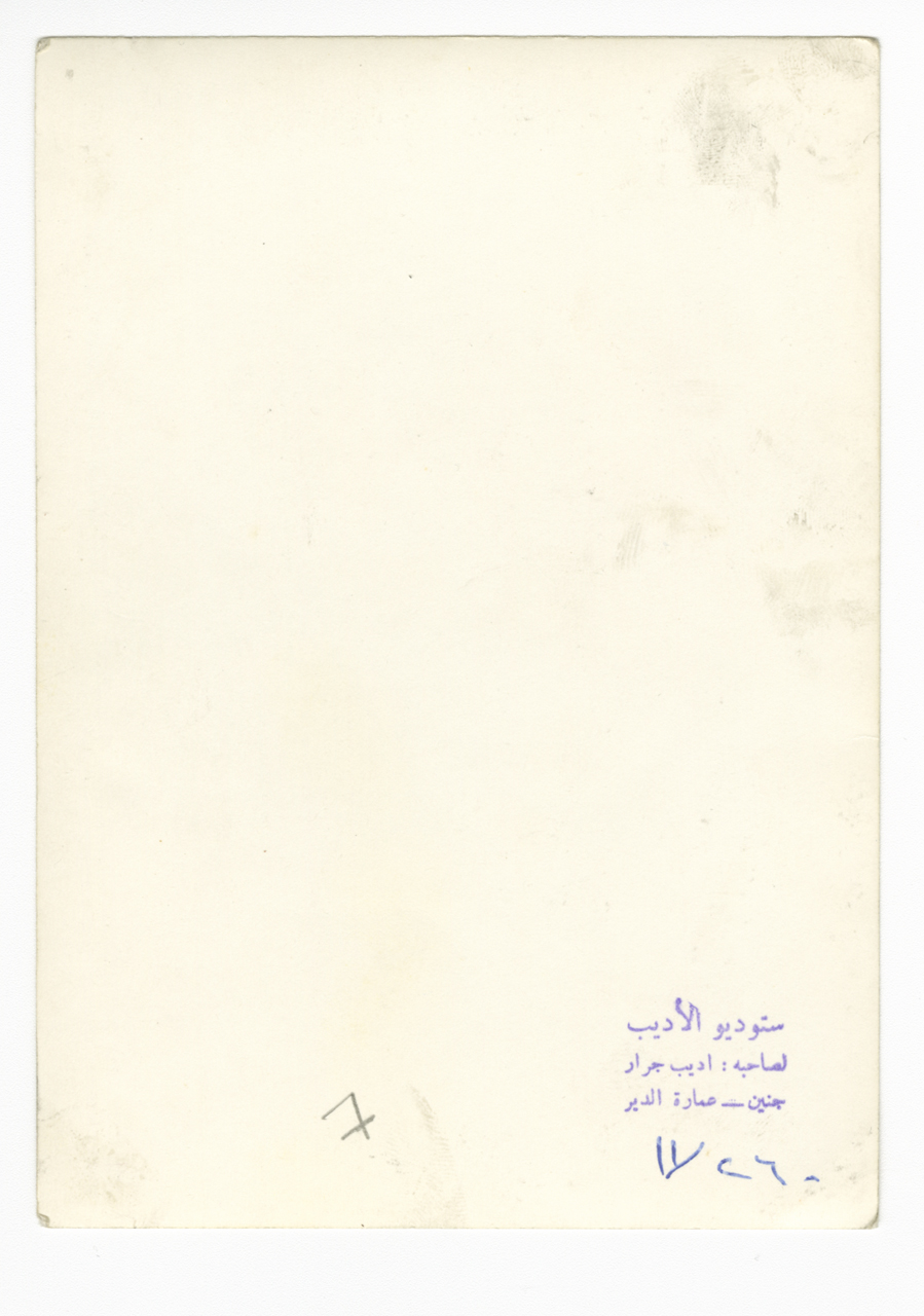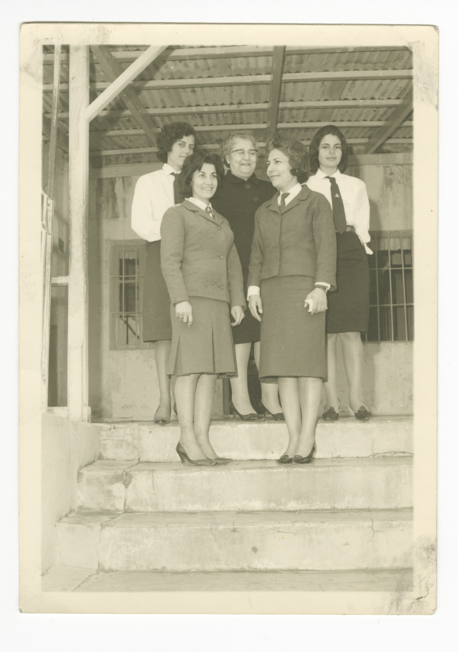 .صورة غير ملونة، تظهر فيها غادة رشيد ومجموعة من المعلمات في مدرسة جنين