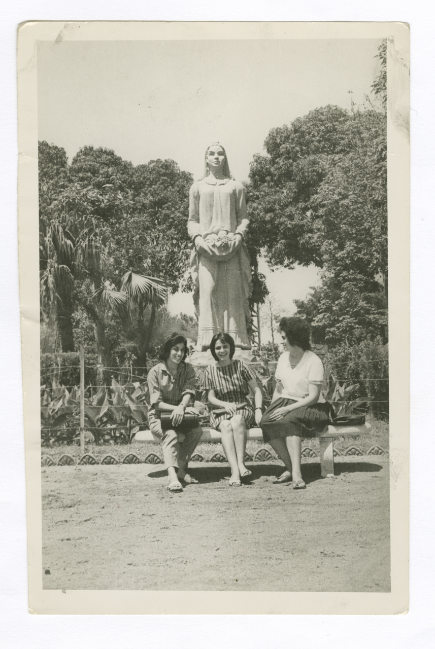 A black-and-white photograph of Ghada Rashid on a trip with friends.