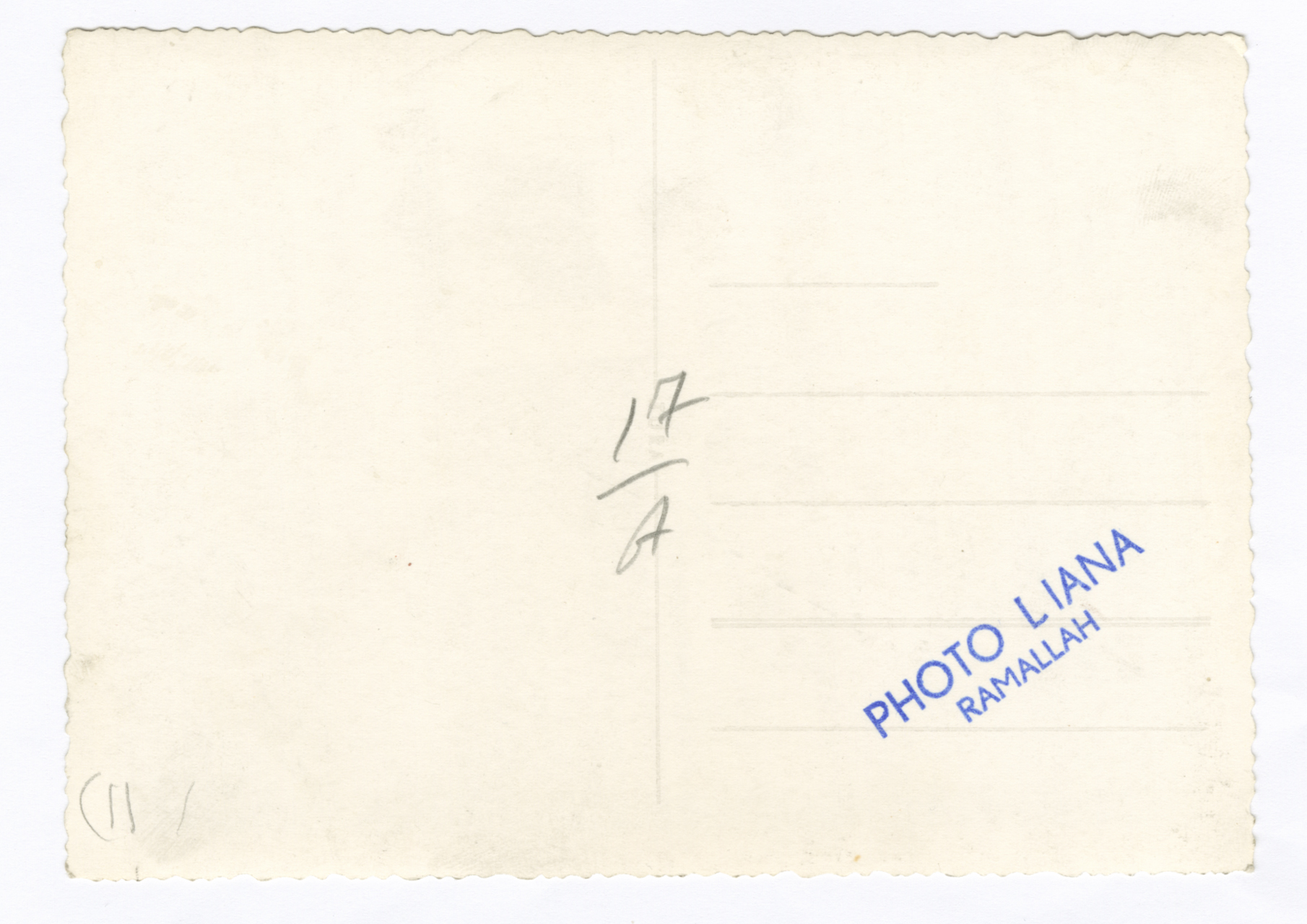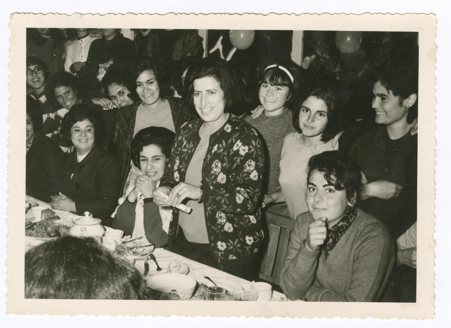 A black-and-white photograph of Ghada Rashid with teachers and students.