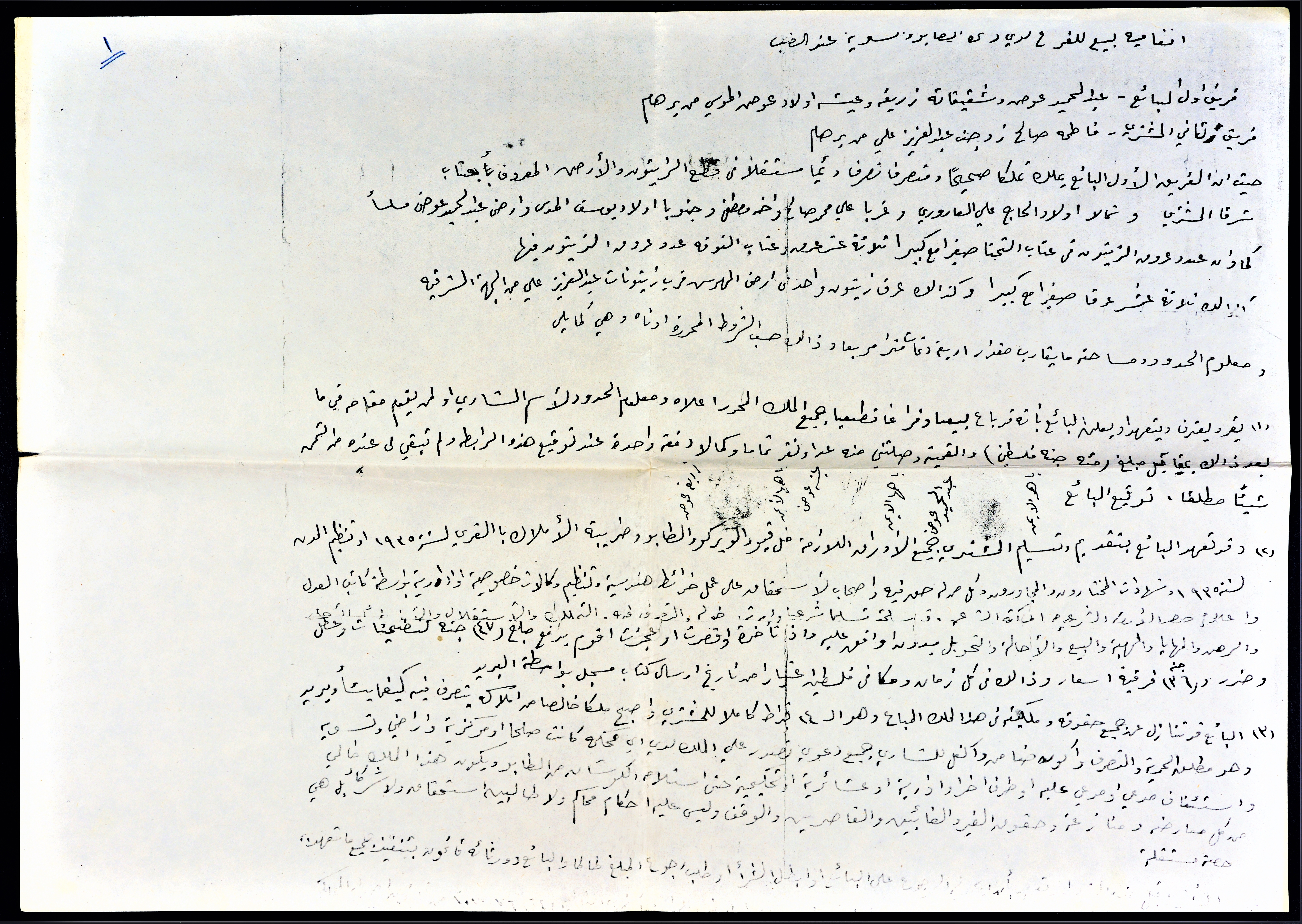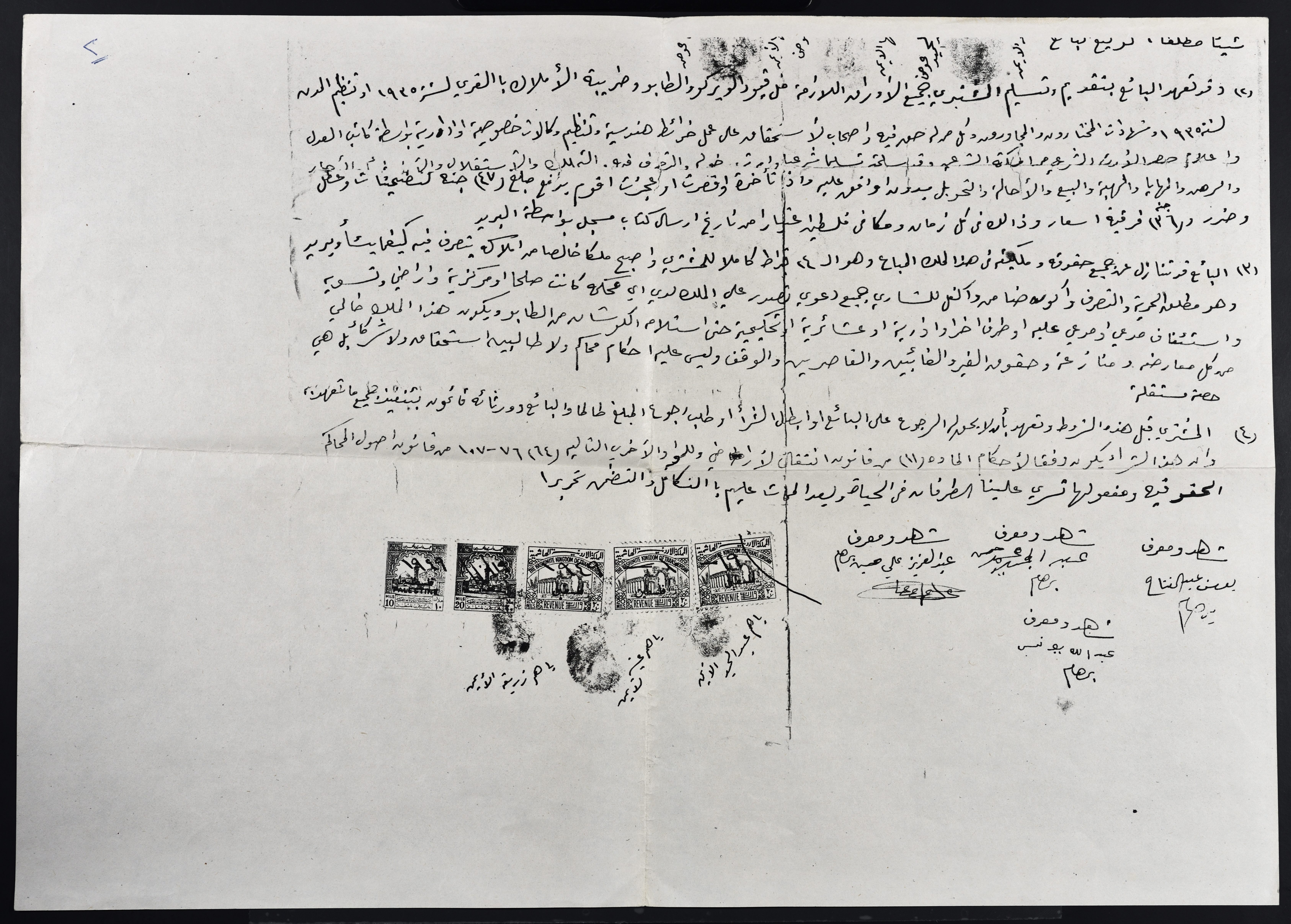 اتفاقية بيع قطعة أرض عقدت بين البائع عبد الحميد عوض وشقيقاته والمشترية فاطمة صالح زوجة السيد عبد العزي علي، صدرت اتفاقية البيع في عام 1949م، وتحمل الوثيقة توقيع كل من الشهود ولابائع وبصمة المشترية