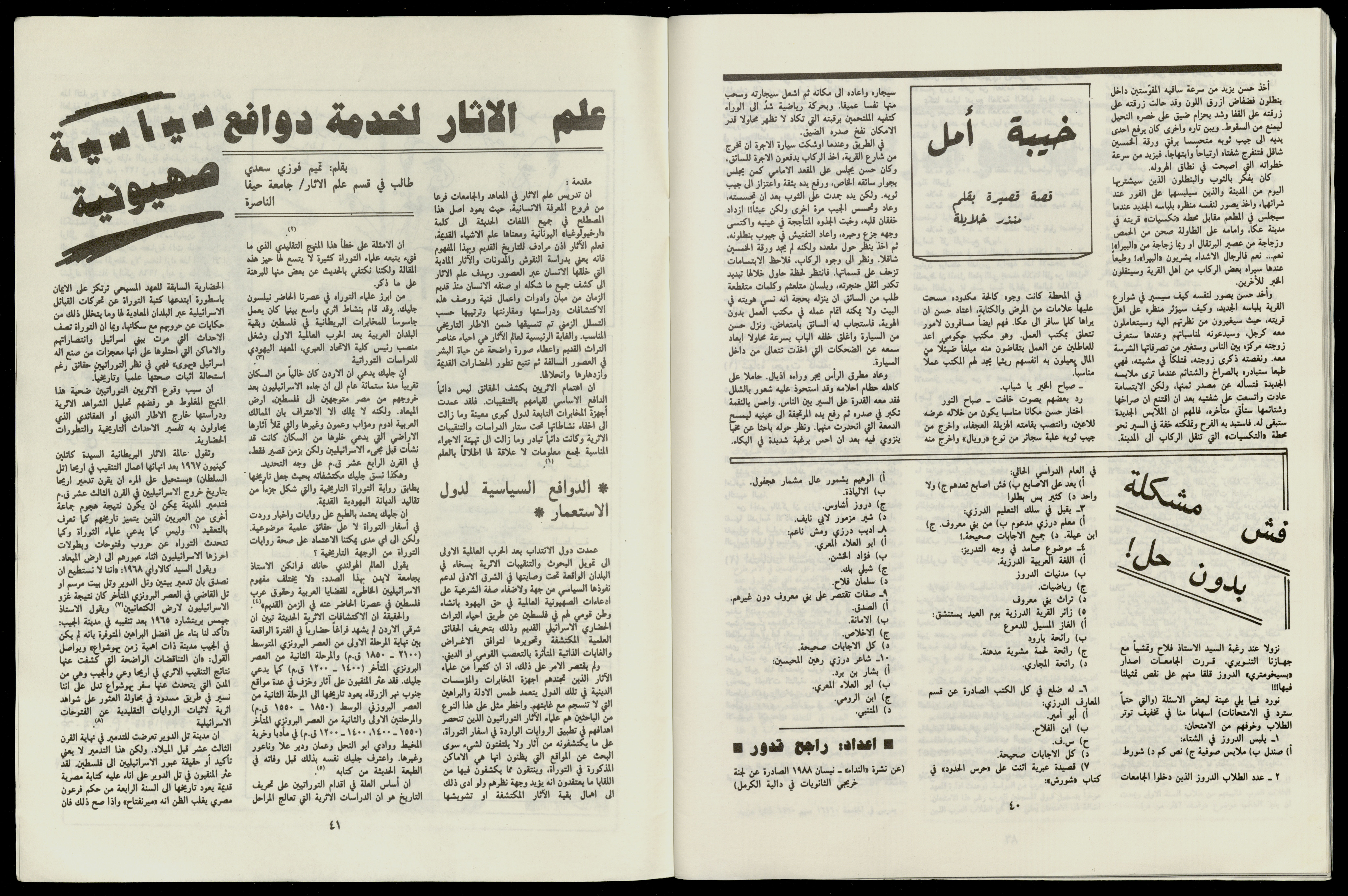 مادة مطبوعة باللغة العربية، وهي مجلة ضمن مجموعة مجلات النساء الديمقراطي تحوي مختلف المواضيع نشرة لمرة واحدة تصدرها لجنة الطلاب العرب جامعة حيفا عام 1988