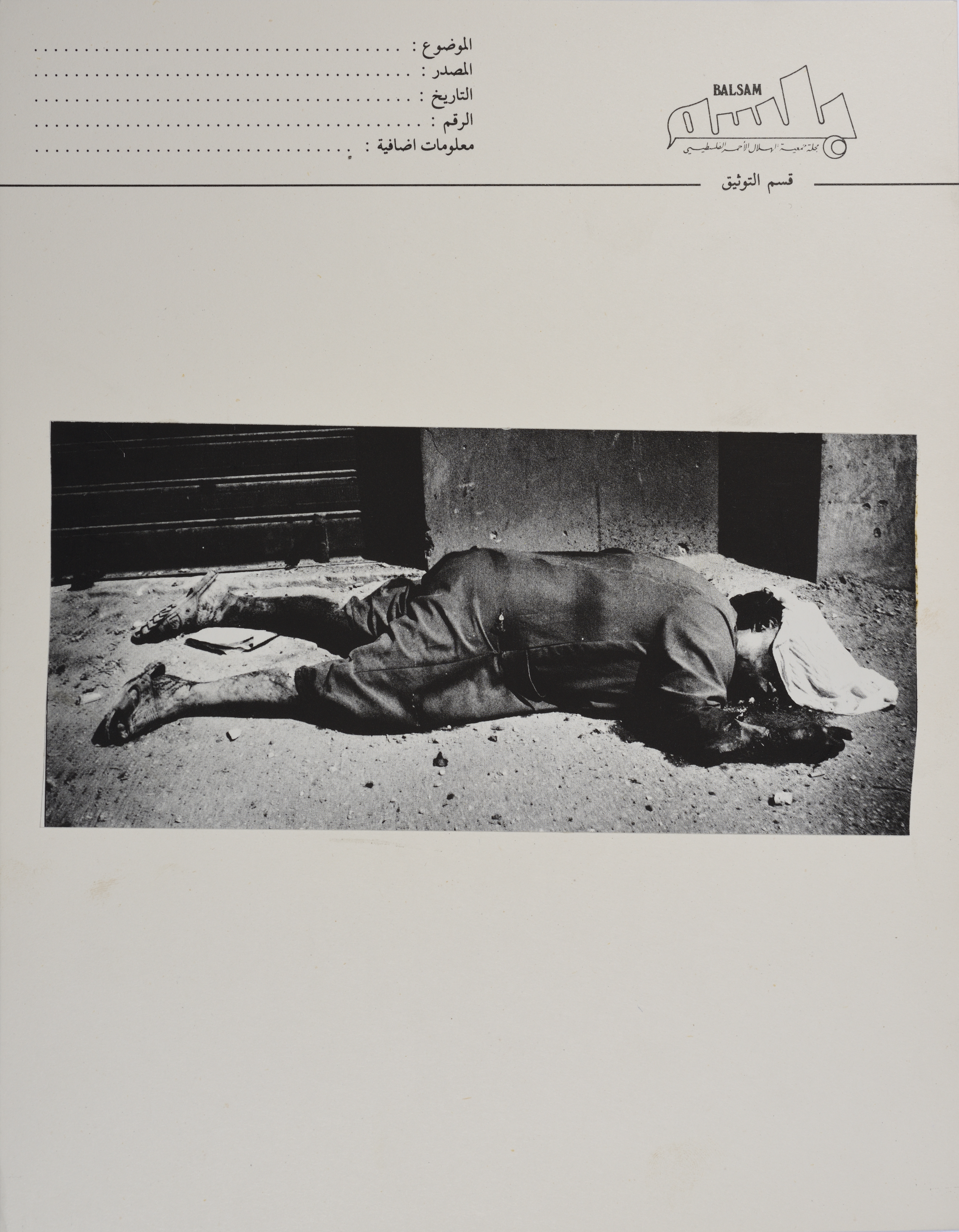 صورة غير ملونة لأحد الجثث المحترقة خلال مذبحة صبرا وشاتيلا التي نفذها الجيش الاسرائيلي مع حزب الكتائب اللبناني وجيش لبنان الجنوبي في مخيم شاتيلا وحي صبرا في لبنان. الصورة وُجدت مُلصقة على بطاقة مروسة بشعار مجلة بلسم، وهي طريقة للأرشفة استخدمتها جمعية الهلال الاحمر الفلسطيني.