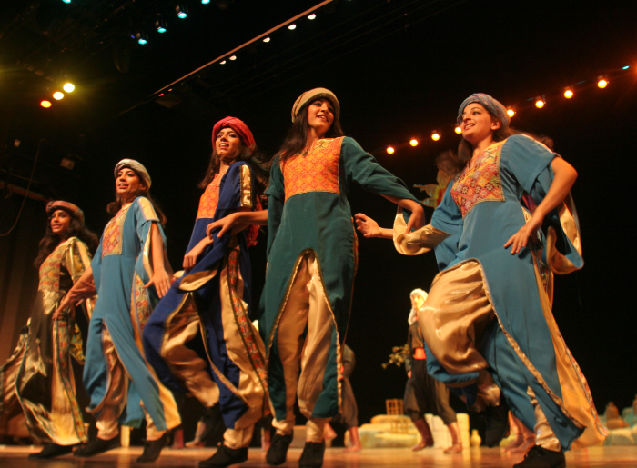 Taken in 2006, this colour photograph shows el-Funoun Palestinian Popular Dance Troupe's dance show, ""Raqsit Shamis" [Dance of Sun].
