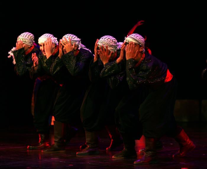Taken in 2006, this colour photograph shows el-Funoun Palestinian Popular Dance Troupe's dance show, ""Raqsit Shamis" [Dance of Sun].