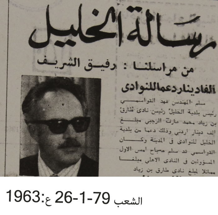 Found in Fahed Qawasmi's collection and printed in Arabic in 26/1/1979, this clipping from al-Sha'b Newspaper (issue no. 1963) shows an article about Qawasmi's contribution to clubs in Hebron.