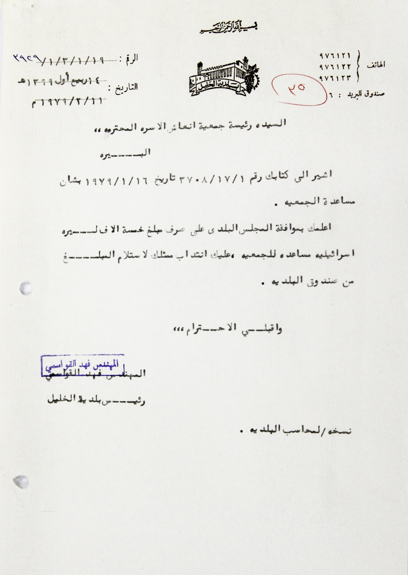 Printed in Arabic, this document shows a letter from the Mayor of Hebron Fahed Qawasmi to the Chairwoman of In'ash el-Usra Society regarding an approval on a disbursement.