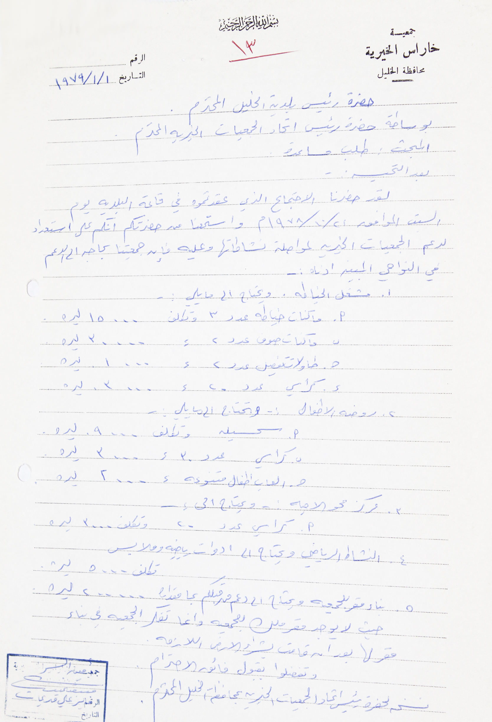 Handwritten in Arabic, this document shows a letter from Kharas Charitable Society to the Mayor of Hebron aking for the Mayor's support.