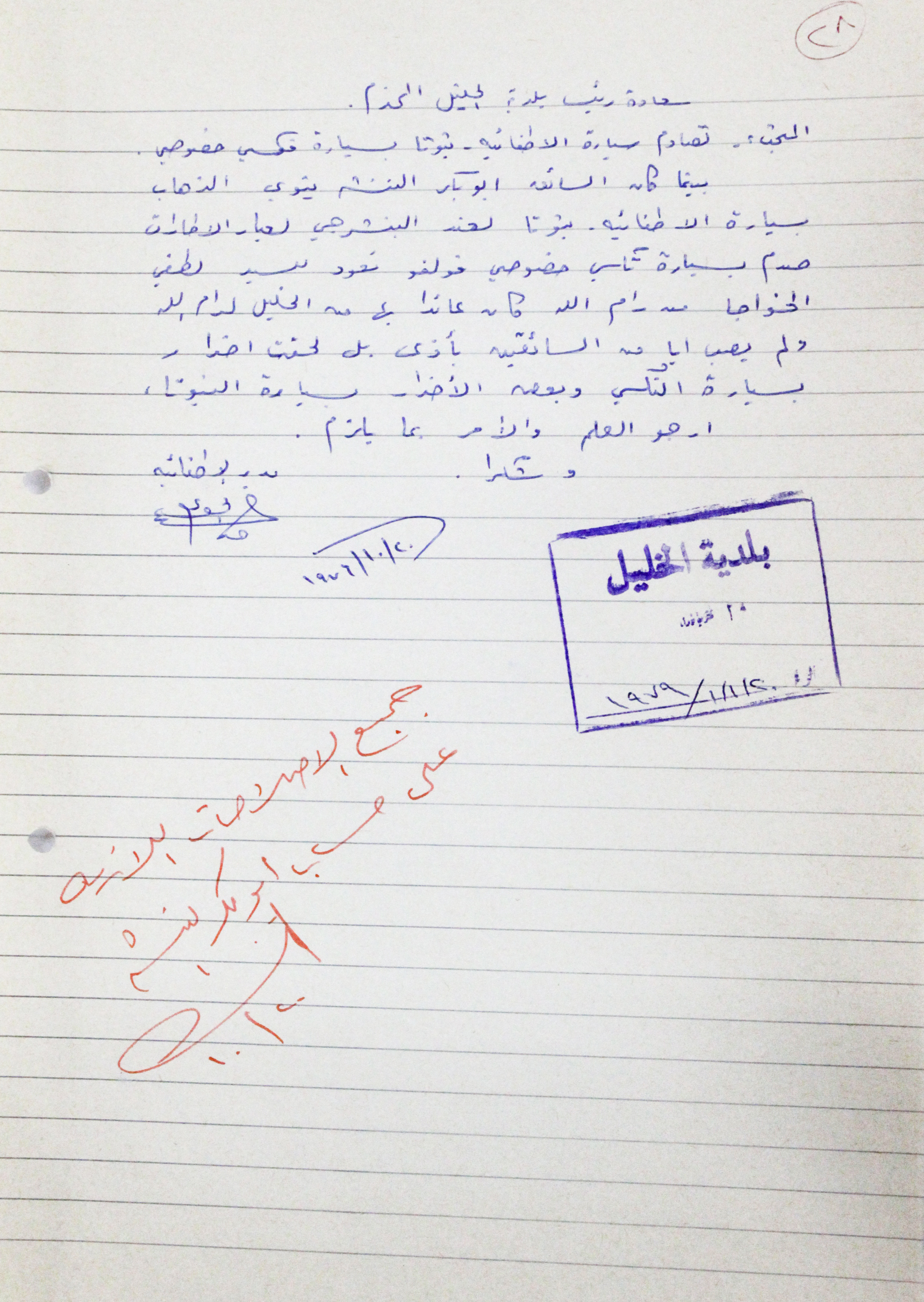 Handwritten in Arabic, this document shows a letter from the Fire Department Director to the Mayor of Hebron Fahd al-Qawasmi.