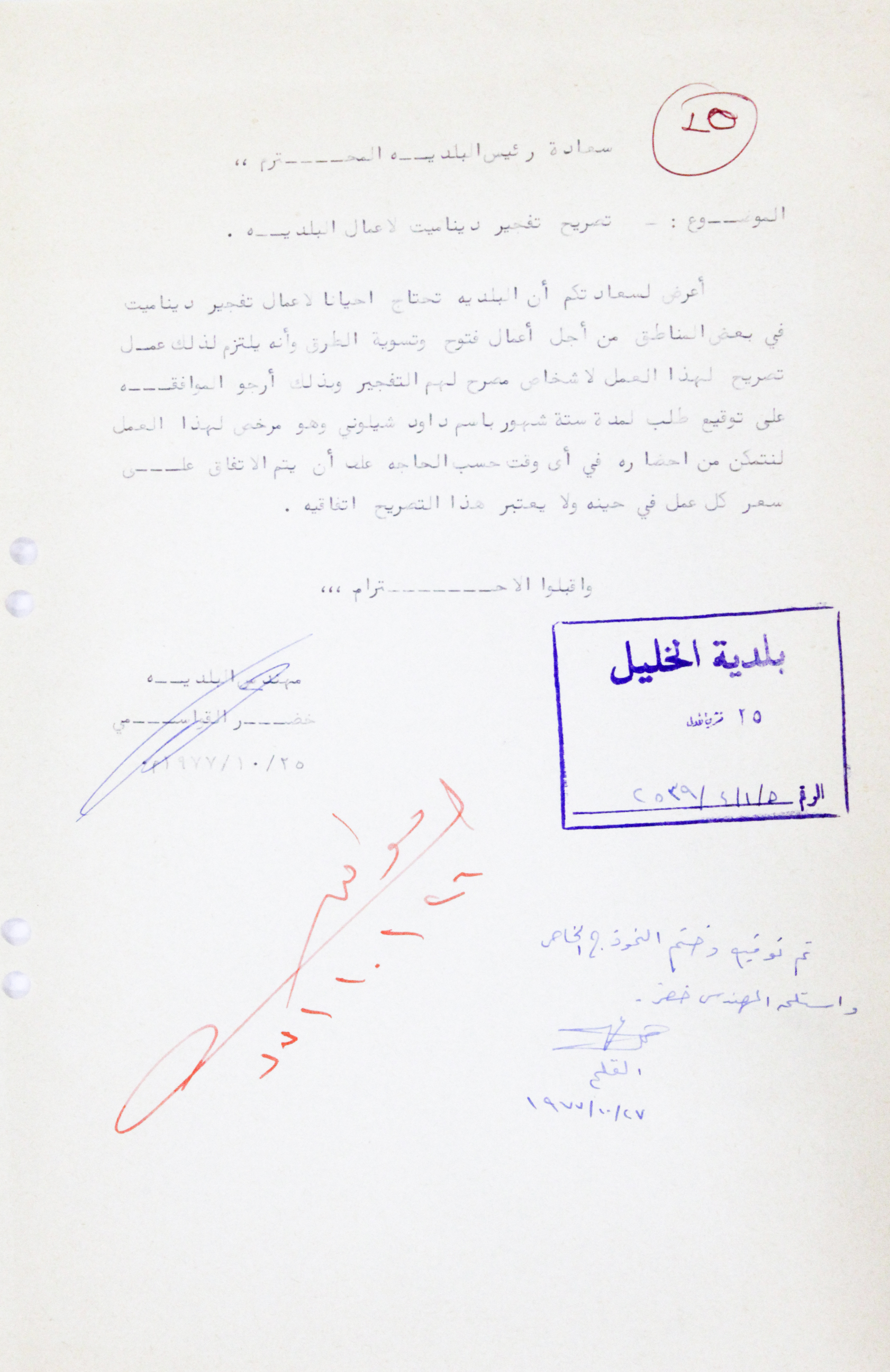 Printed in Arabic, this document shows a letter from Khader Qawasmeh, engineer of the municipality, to the Mayor of Hebron Fahd al-Qawasmi regarding a permit to use dynamite for works done by Hebron Municipality.