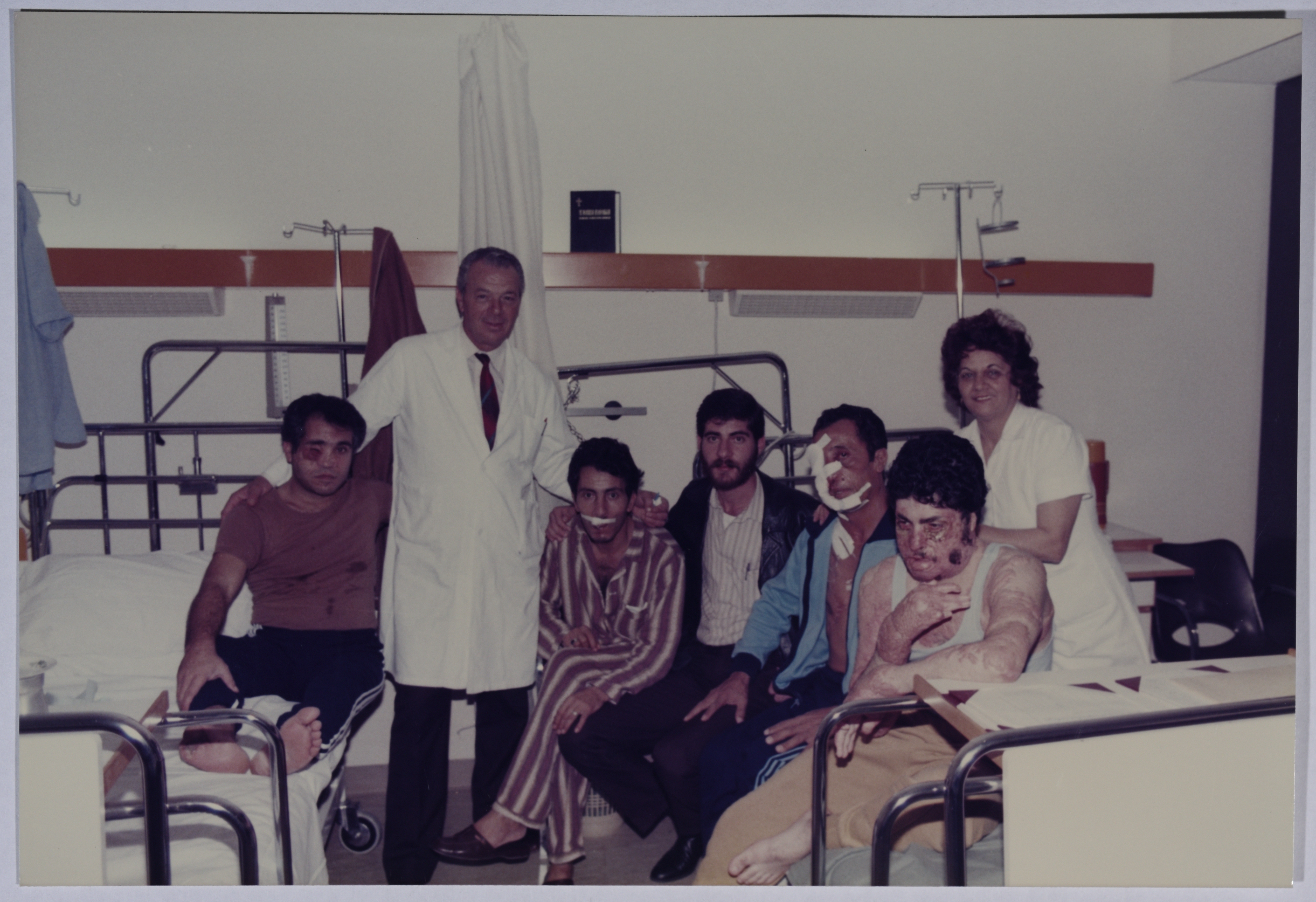 صورة ملونة لمجموعة من مصابي الاجتياح الاسرائيلي للبنان في أحد مستشفيات قبرص. التُقِطت الصورة في أعقاب الاجتياح الاسرائيلي للبنان أو ما يُعرف بعملية الجليل، التي قامت بها "اسرائيل" بحجة حماية المستوطنات الاسرائيلية في الجليل من خطر صواريخ الفدائيين الفلسطينيين التي كانت تُطلق في شمال فلسطين، إلا أن الهدف الحقيقي من الحرب كان إخراج منظمة التحرير الفلسطينية من لبنان. وقد نُقل مجموعة من الجرحى للعلاج في قبرص واليونان مع خروج مجموعة من أعضاء منظمة التحرير وأعضاء جيش التحرير ممن غادروا بيروت.