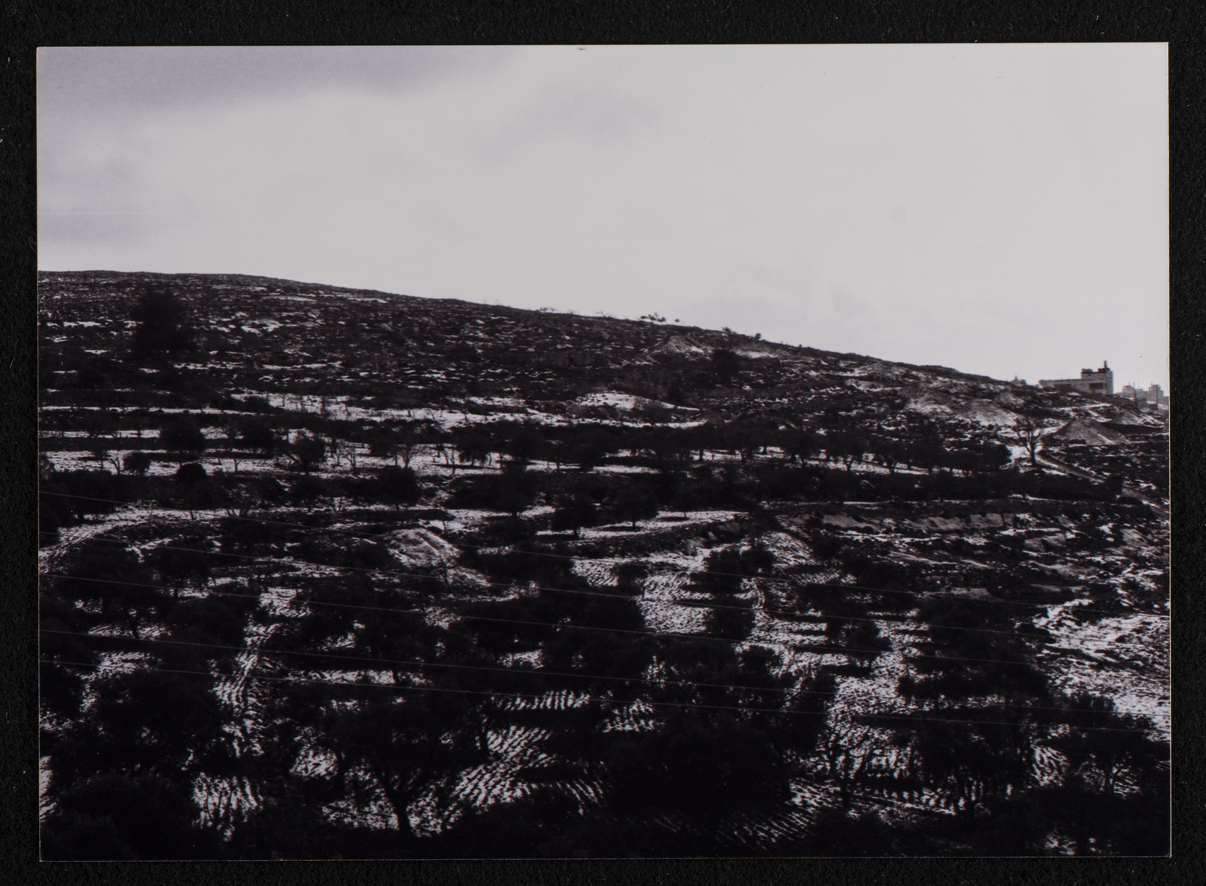 صورة توثق تراكم الثلوج على الاراضي الزراعية بين مدينة رام الله وبلدة بيرزيت.