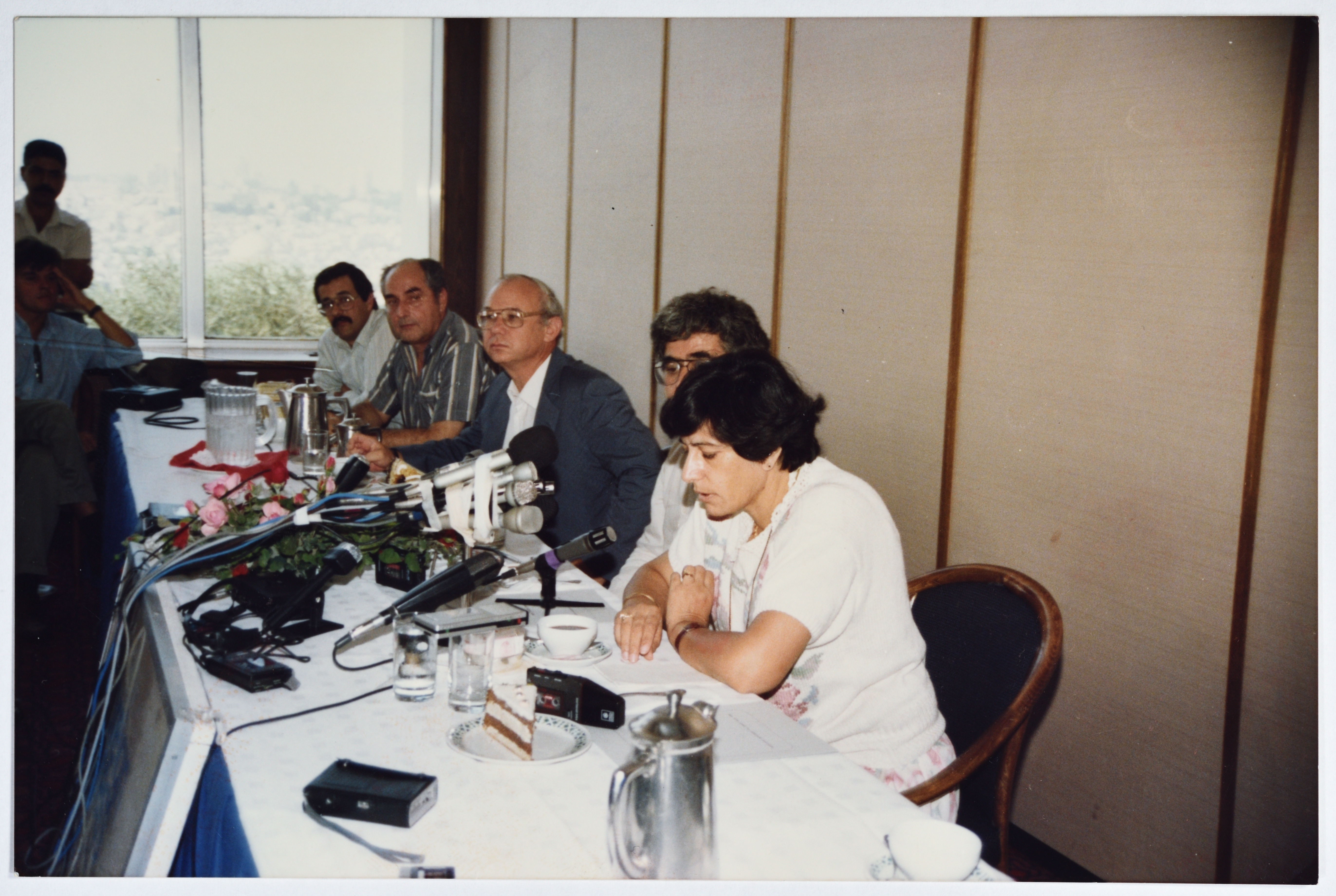 صورة لزهيرة كمال برفقة غسان الخطيب وفيصل الحسيني وسري نسيبة.