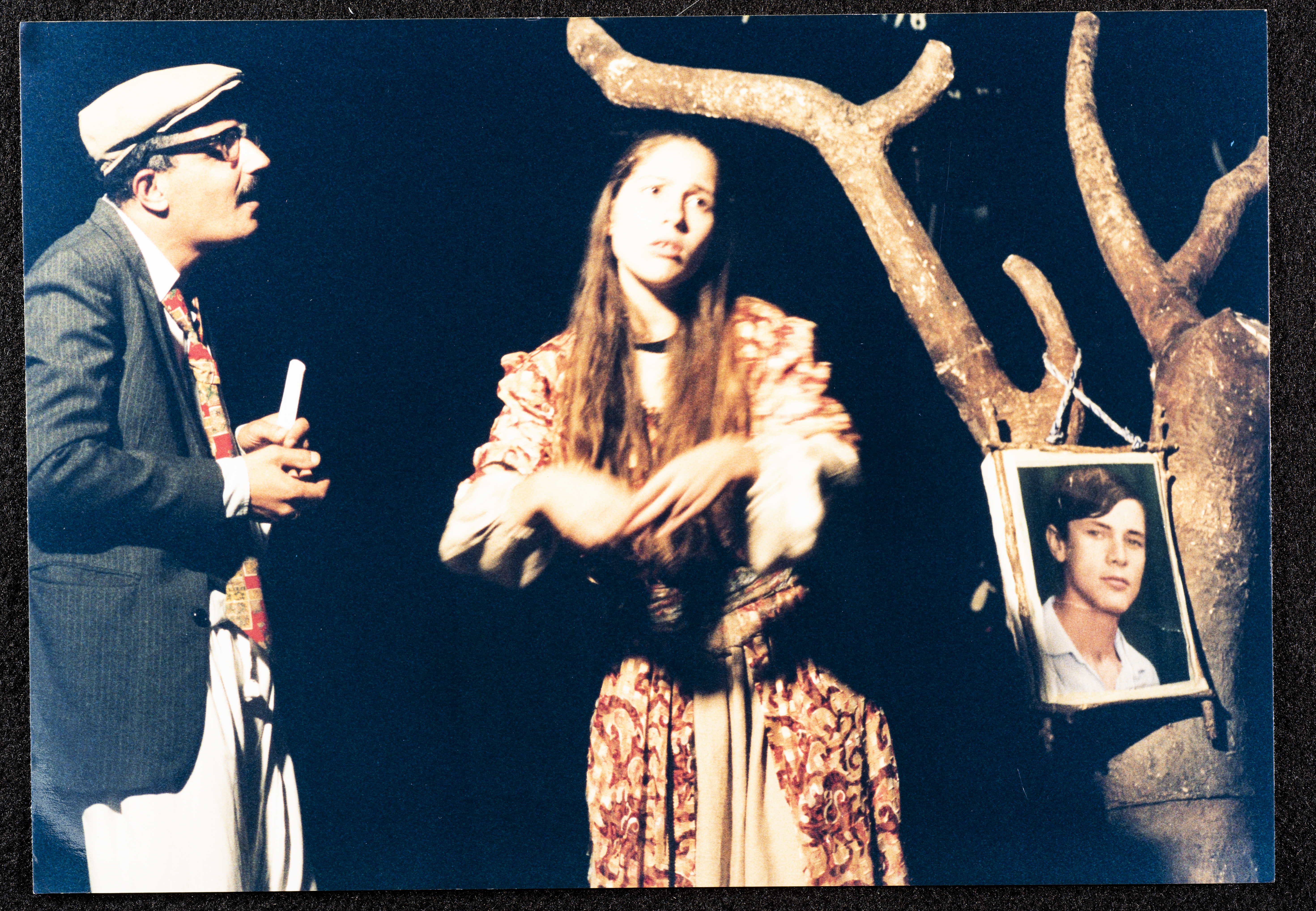 Taken in 1997, this colour photograph captures a freeze of al-Kasaba Theater and Cinematheque's play, "al-Mahajir" [the immigrant]. Directed by Muhammad Mekhmas, the play ran in Jerusalem, Galilee, Jordan, Syria, and Tunisia, featuring a cast of Palestinian actors, including Muhammad al-Bakry, Makram Khury, Mahmud ʿawad, Khalid al-Maṣu, Walid ʿabdelsalam, George Ibrahim, Salwa Naqara, ʿarin ʿumary, Husam abu ʿaysha, and Bassam Zuʿmut.