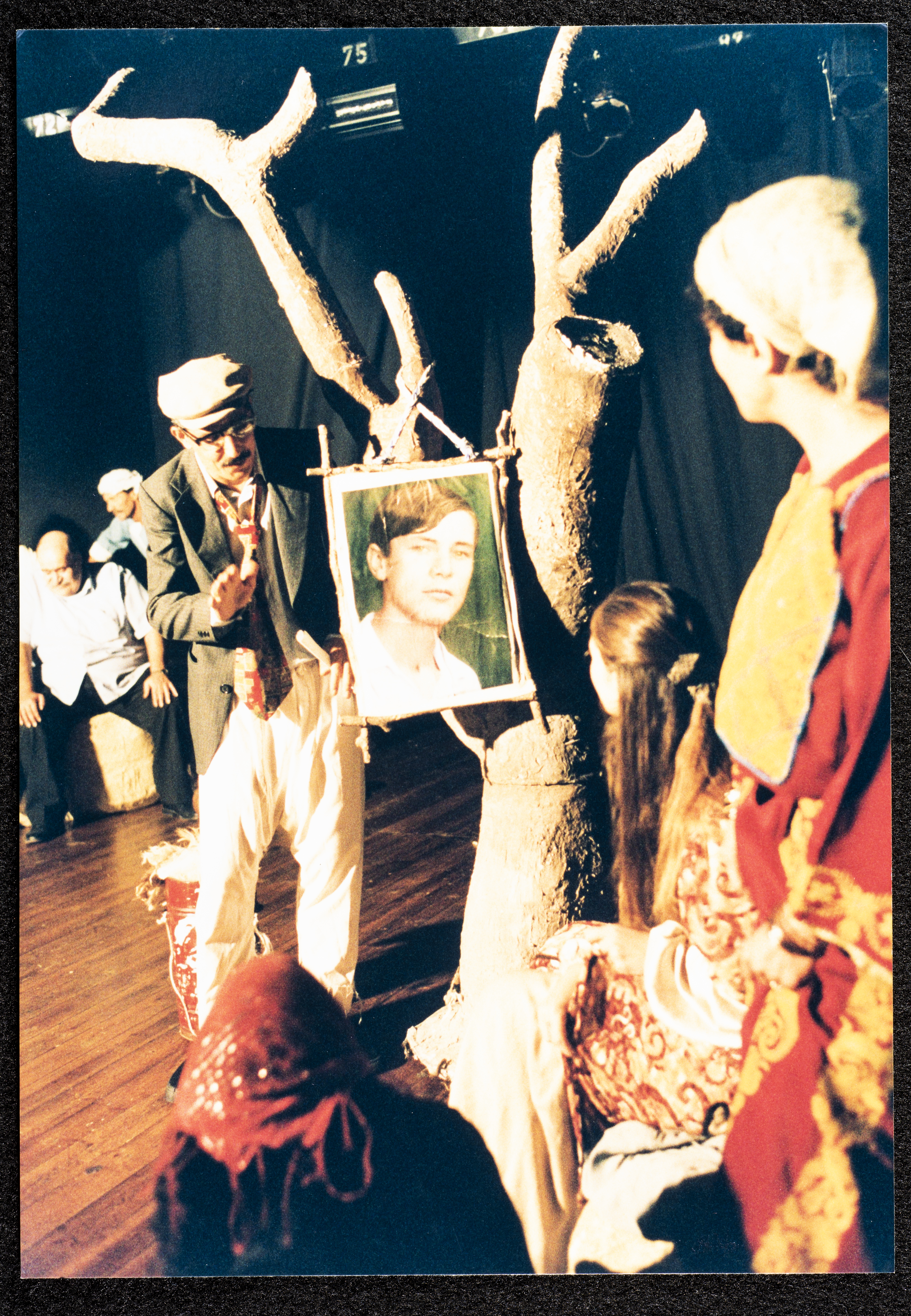 صورة ملونة من عرض لمسرحية المهاجر، التي أخرجها محمد خميس، وأعدها جورج ابراهيم. عرضت مسرحية المهاجر في القدس والجليل والأردن وسوريا وتونس. كما وحازت هذه المسرحية على جائزة أفضل اخراج وأفضل ملابس في مهرجان قرطاج بتونس. المسرحية من تمثيل: محمد البكري، مكرم خوري، محمود عوض، خالد المصو، وليد عبد السلام، جورج ابراهيم، سلوى نقارة، عرين عمري، حسام ابو عيشة، بسام زعمط.