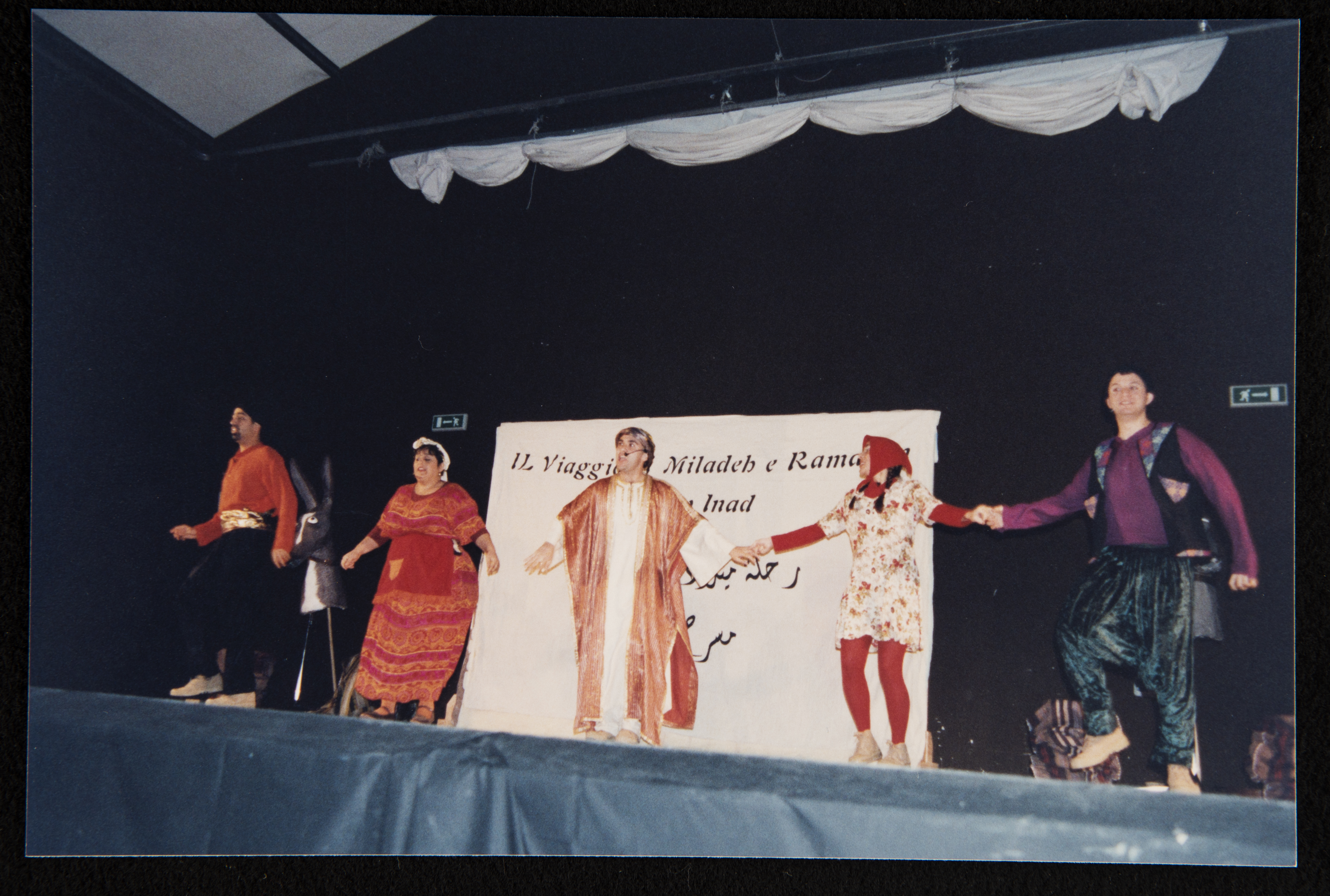 صورة ملونة من عرض مسرحية "رحلة ميلادة ورمضان"، وهي عمل مسرحي من إنتاج وتمثيل فريق مسرح عناد.