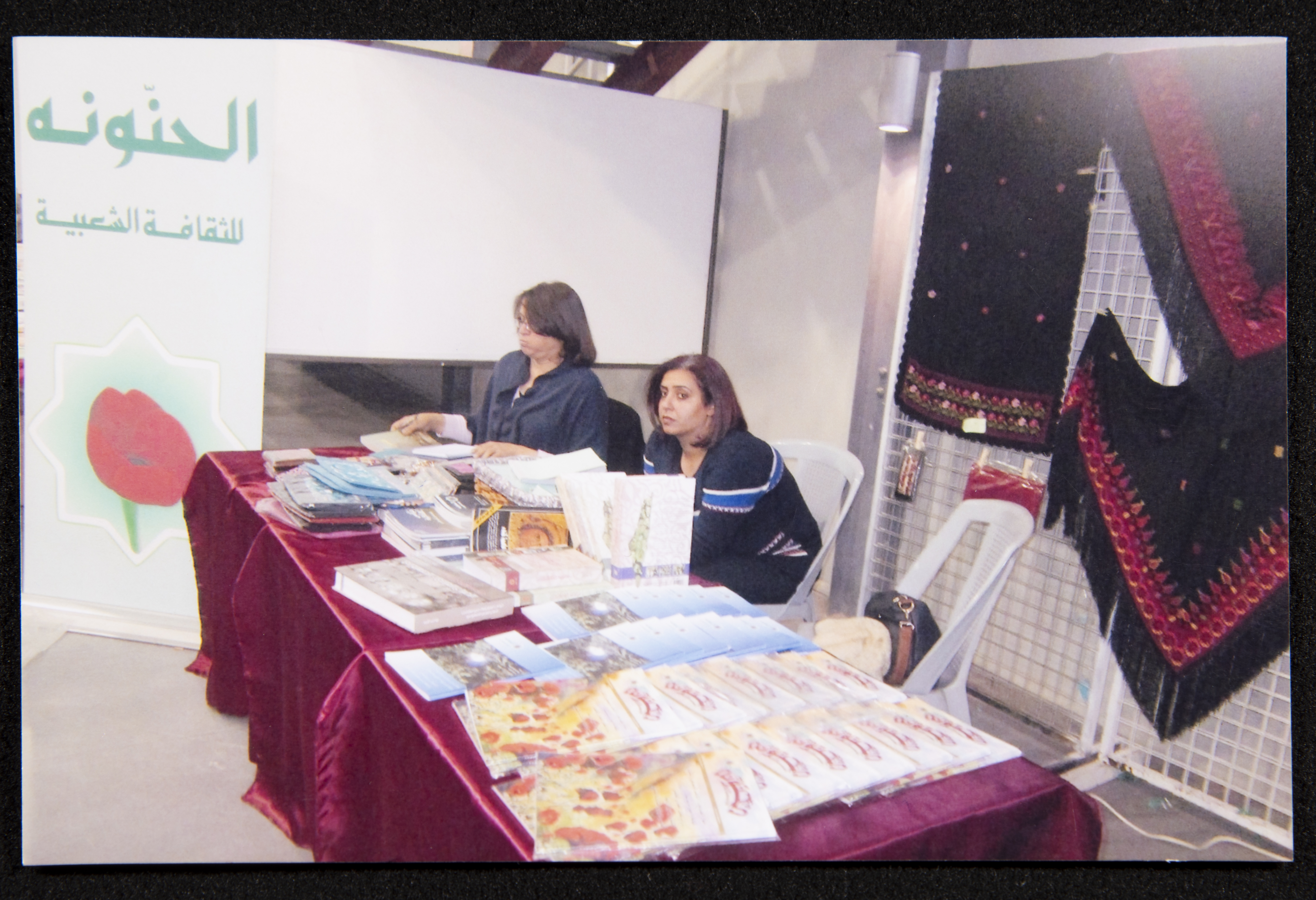 صورة ملونة، يظهر فيها مشاركة فرقة الحنونة في المعرض من خلال عرض المطرزات والزي الشعبي في مدينة عمان عام 2015.