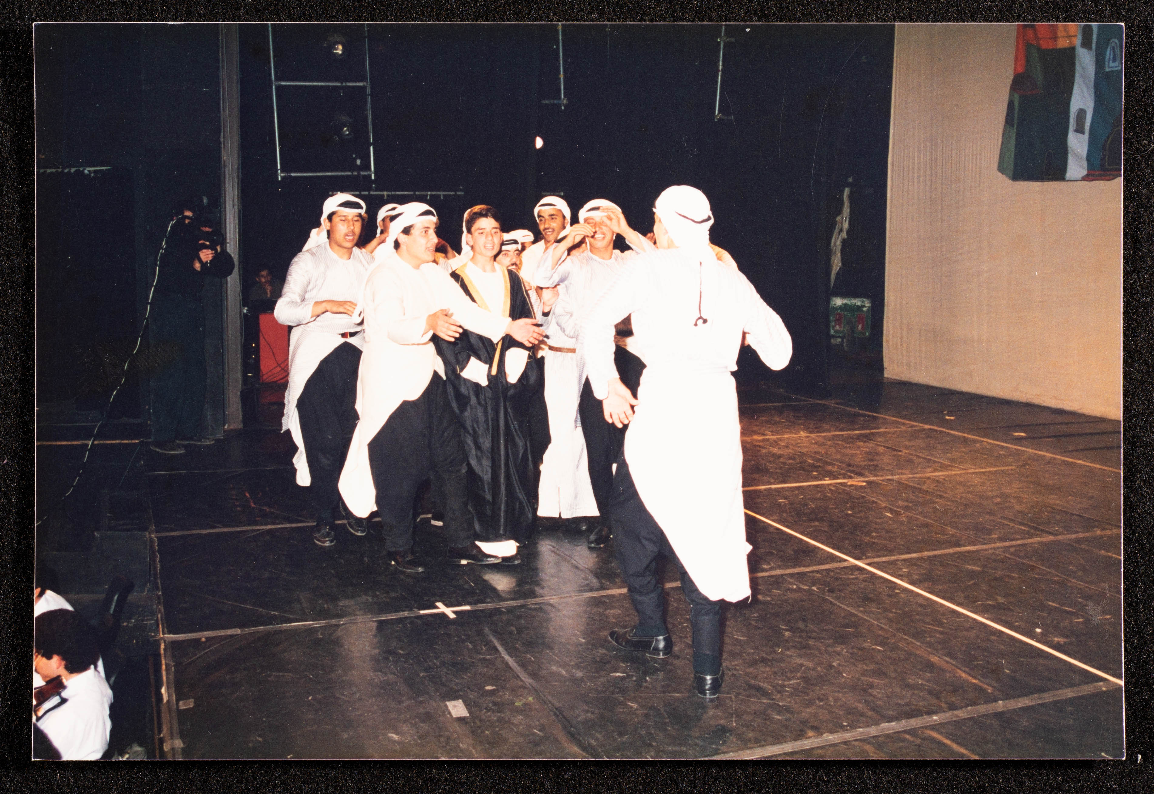 A colour photograph of a performance by al-Hannouneh Troupe.