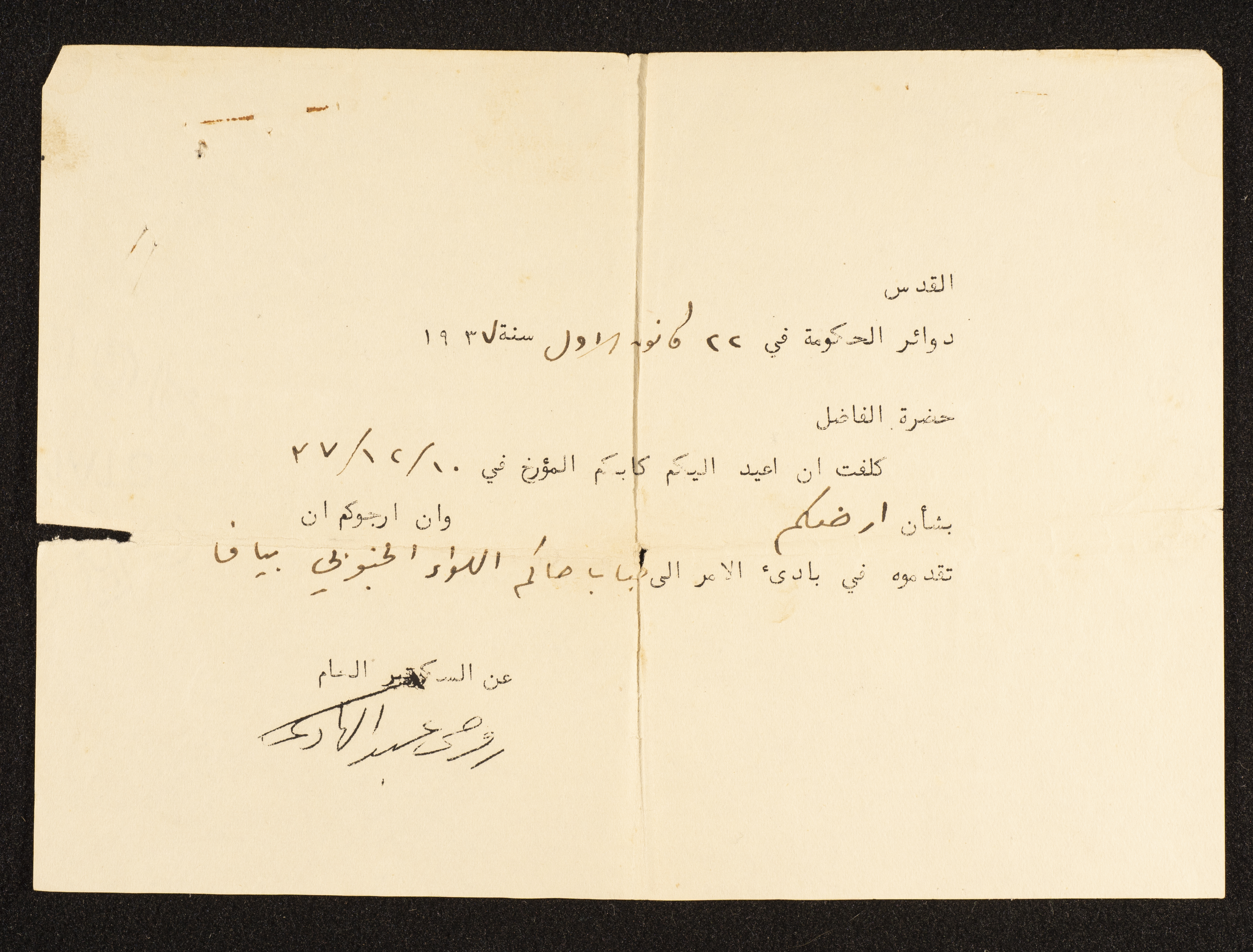 رسالة إلى عبد القادر ارشيد من سكرتير الدوائر الحكومية بالقدس روحي عبد الهادي يطلبه فيها بتقديم كتابه بخصوص أرضه إلى حاكم اللواء الجنوبي بيافا.