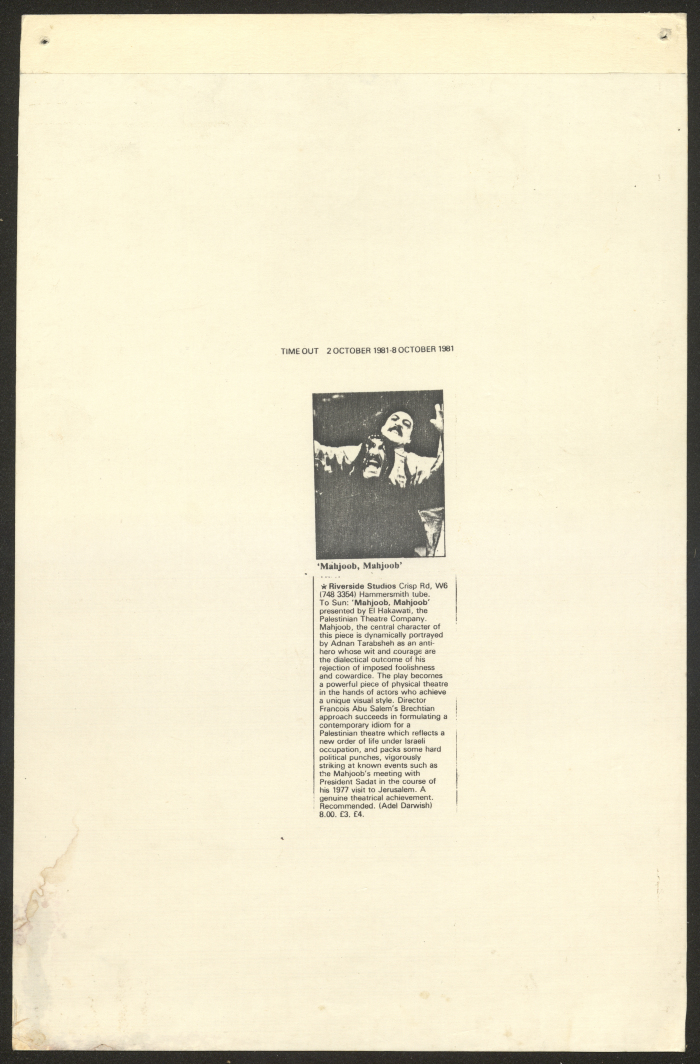Printed in English, this is a magazine clipping from Time Out on the play "Mahjoub, Mahjoub", a production by El-Hakawati Theatre Company in 1981.