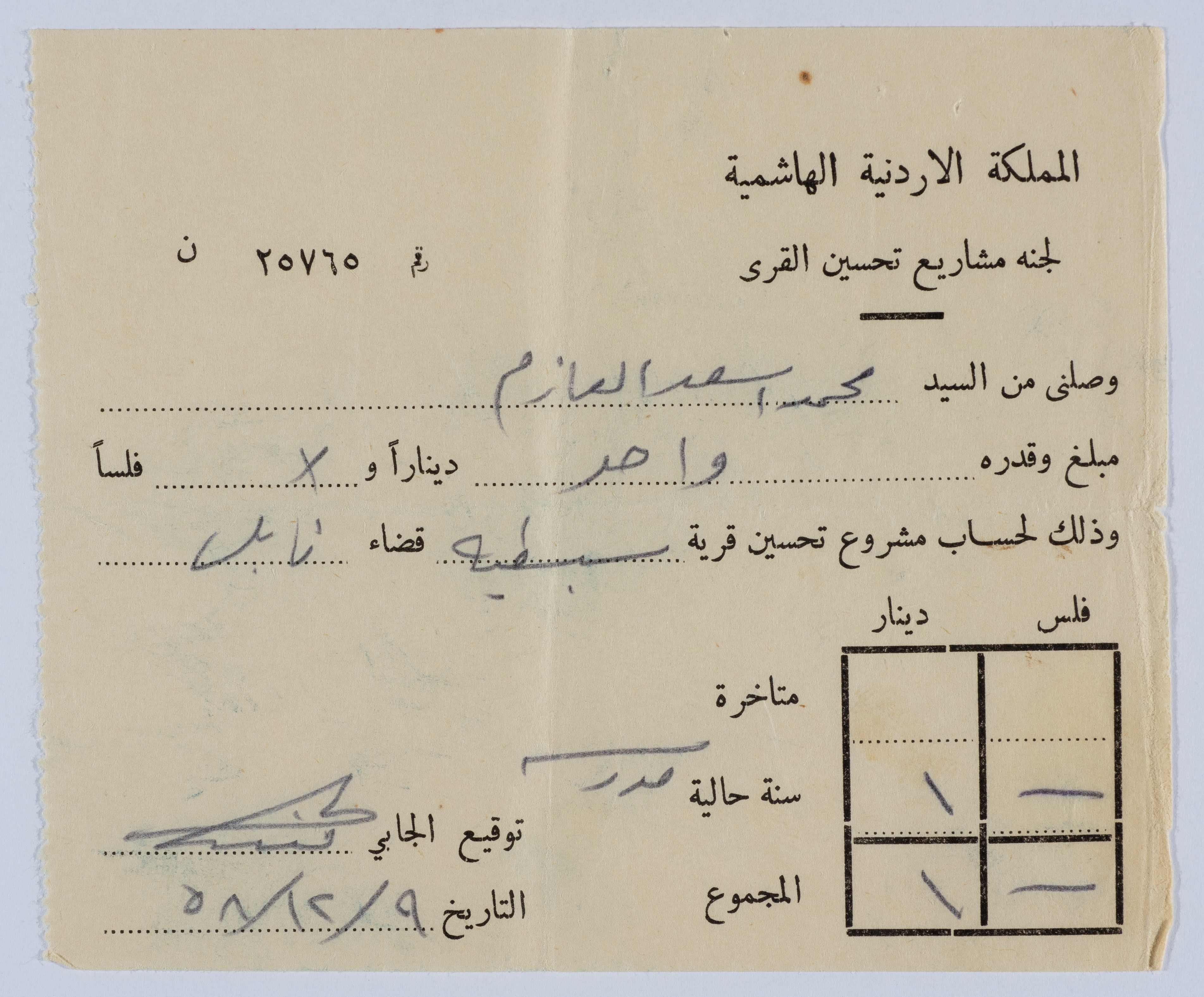 وصل تبرع لحساب مشروع تحسين قرية سبسطية، مقابل تبرع من محمد أسعد العازم أحد أهالي القرية.