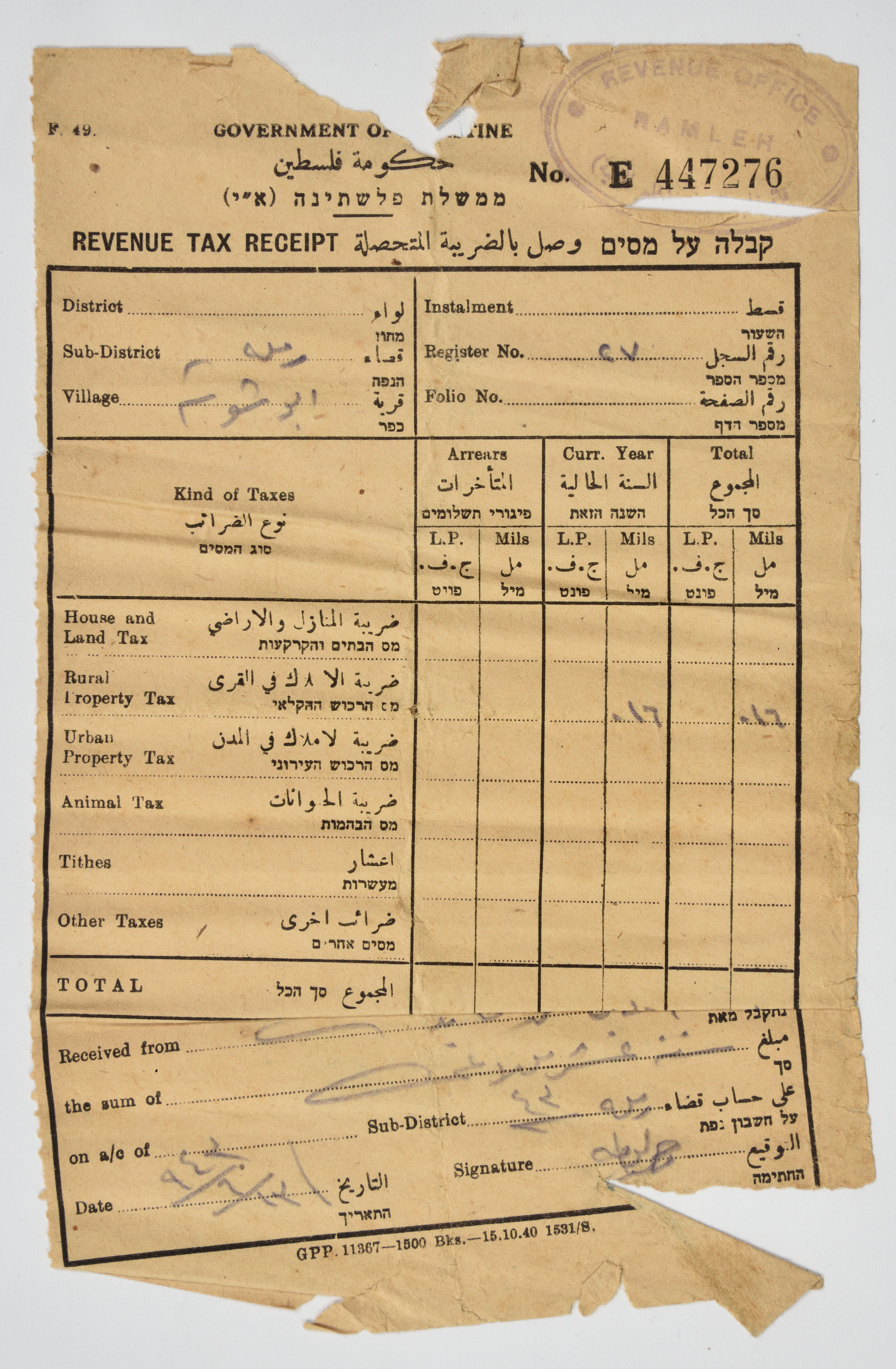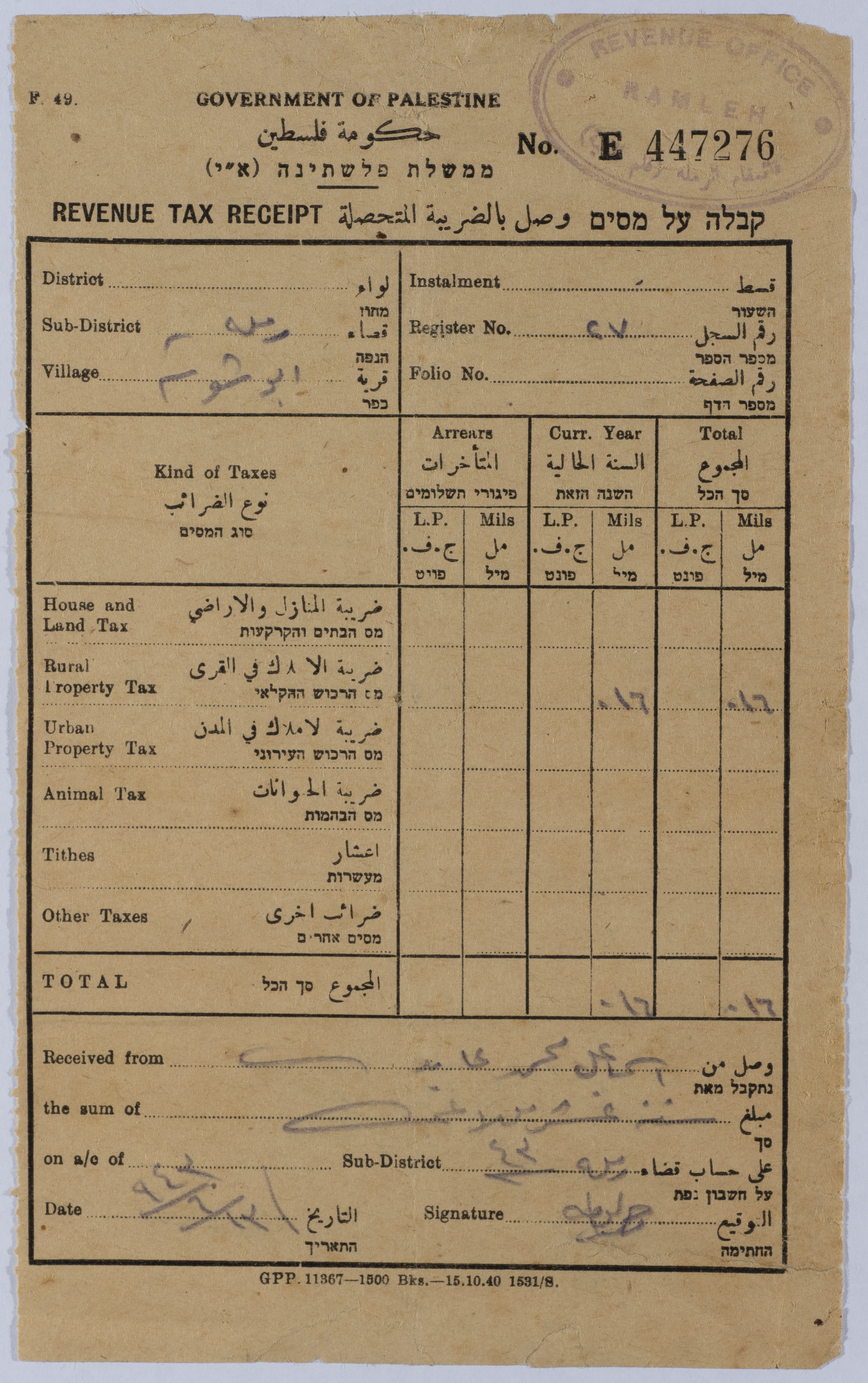 وصل ضريبي بالضريبة المحصلة من حكومة الانتداب البريطاني تابع لقضاء الرملة، في قرية ابو شوشة، باسم: اسماعيل محمد عيد