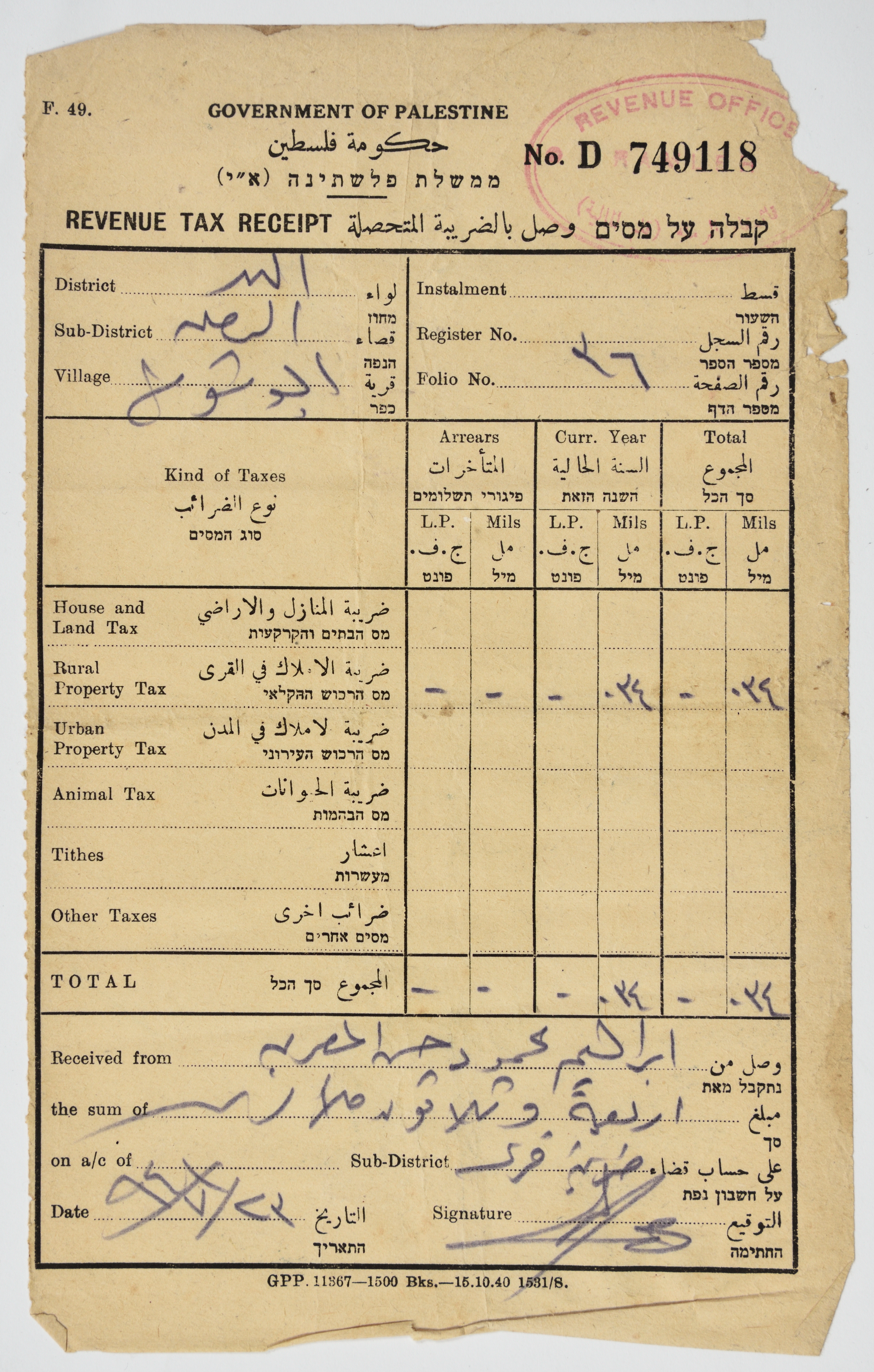 A receipt of the taxes collected from the British Mandate government of Lod District, Ramlah, Abu Shusha village, on behalf of: Ibrahim Mahmoud Hasan al-Masreya.