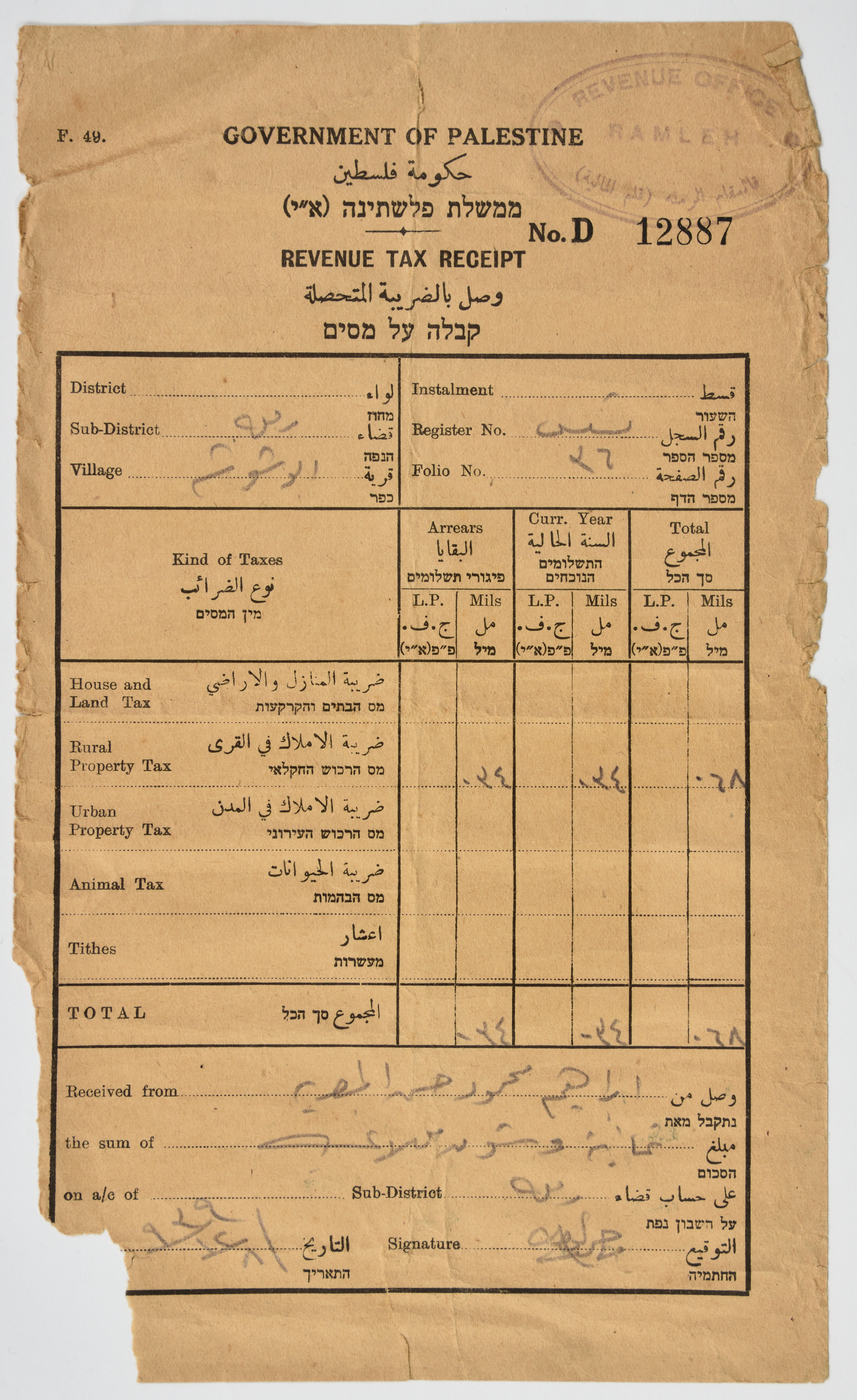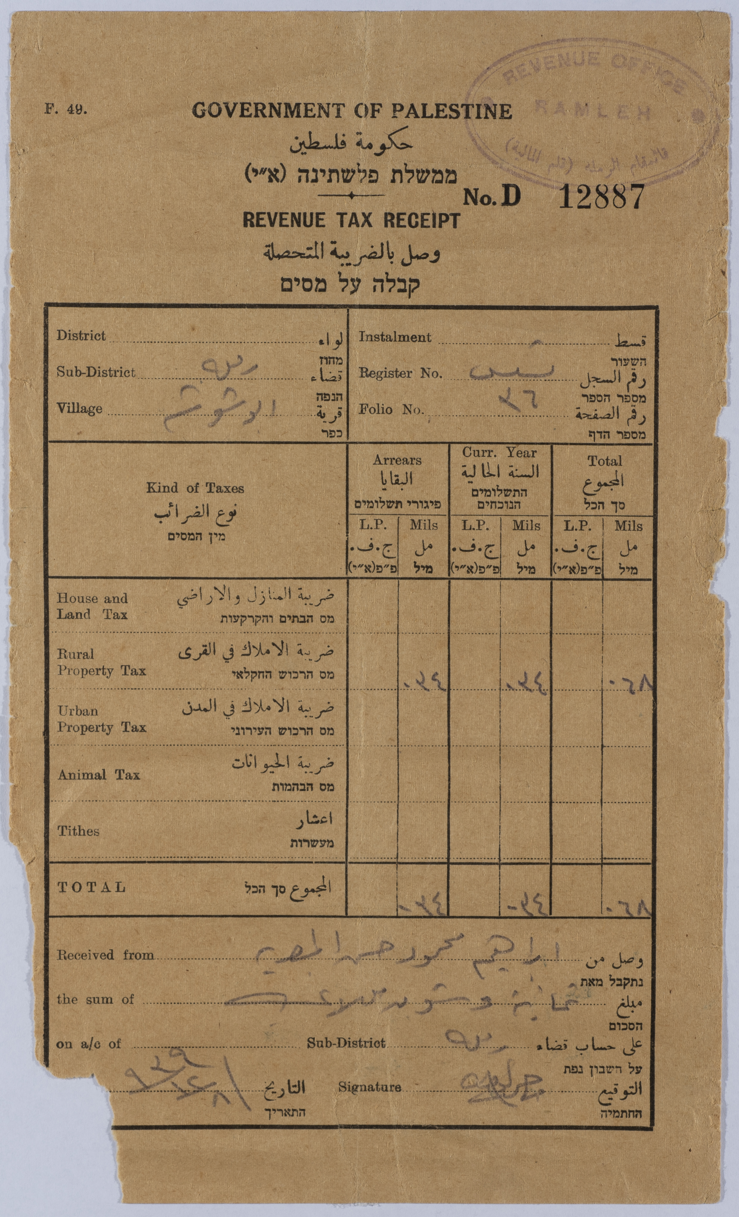 وصل ضريبي بالضريبة المحصلة من حكومة الانتداب البريطاني تابع للواء اللد، قضاء الرملة، في قرية ابو شوشة، باسم: إبراهيم محمود حسن المصرية
