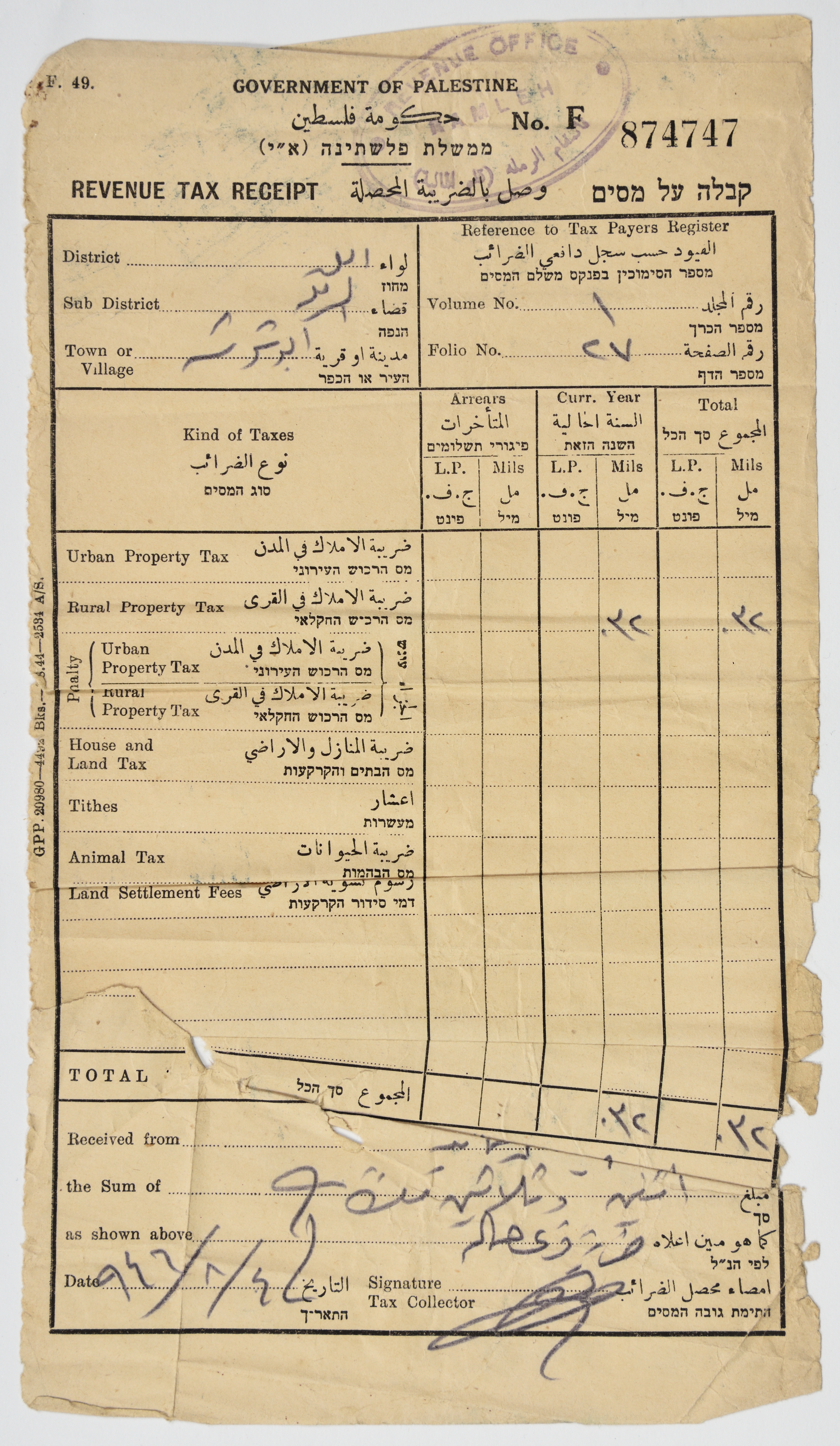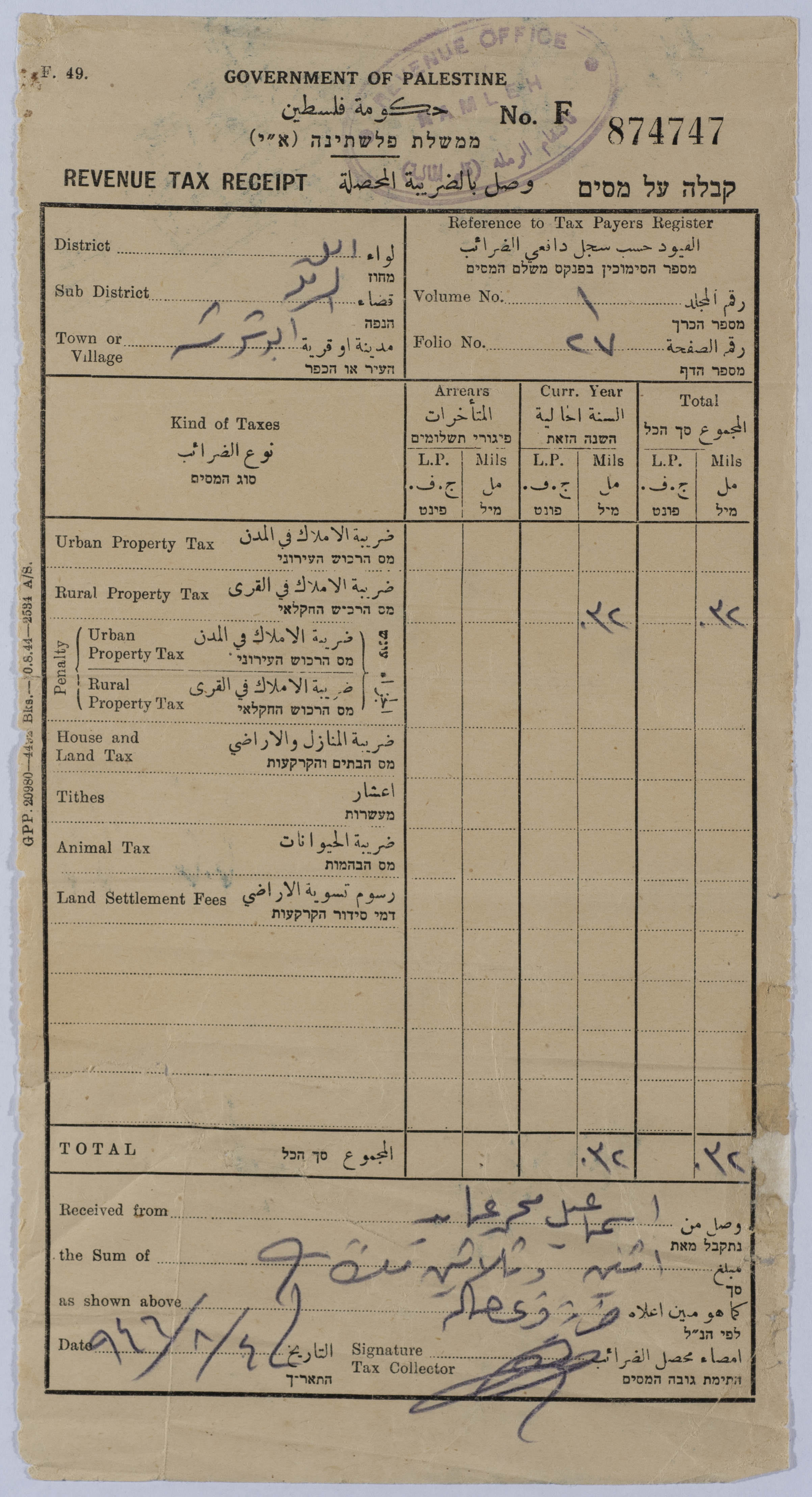 وصل ضريبي بالضريبة المحصلة من حكومة الانتداب البريطاني تابع لقضاء الرملة، في قرية ابو شوشة، باسم: اسماعيل محمد عيد