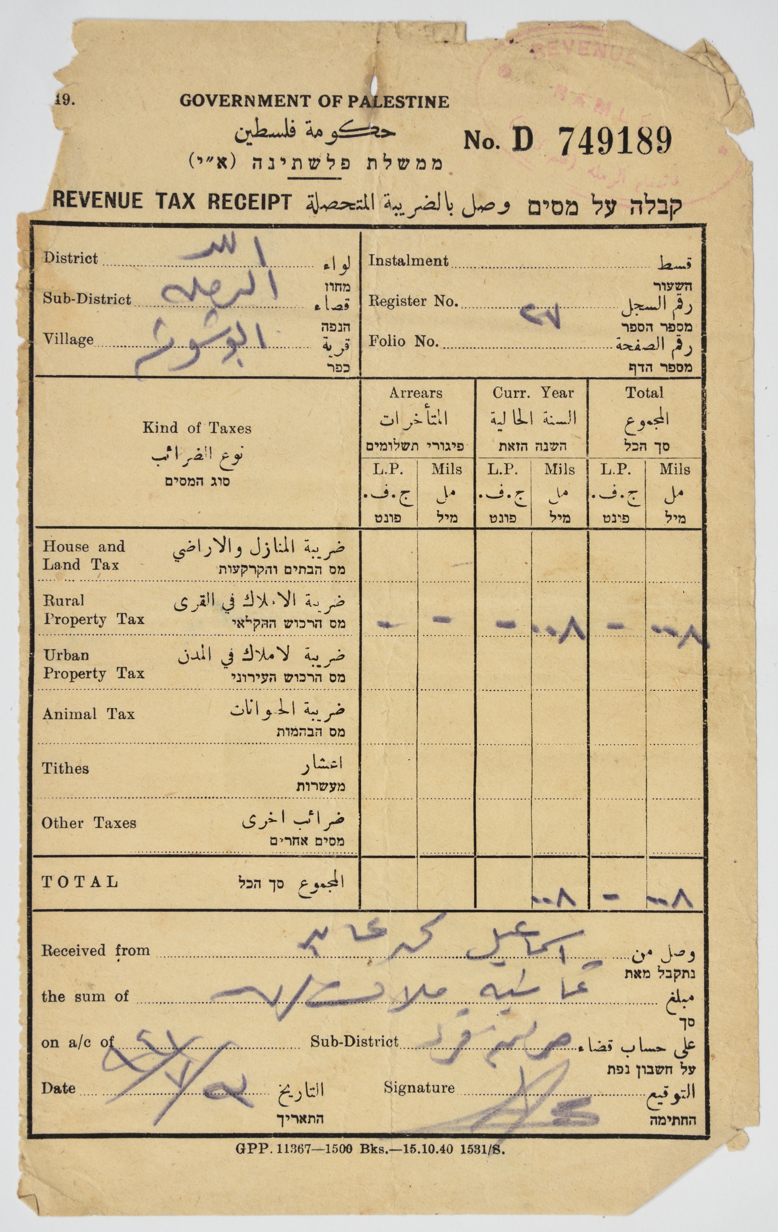 وصل ضريبي من حكومة الانتداب