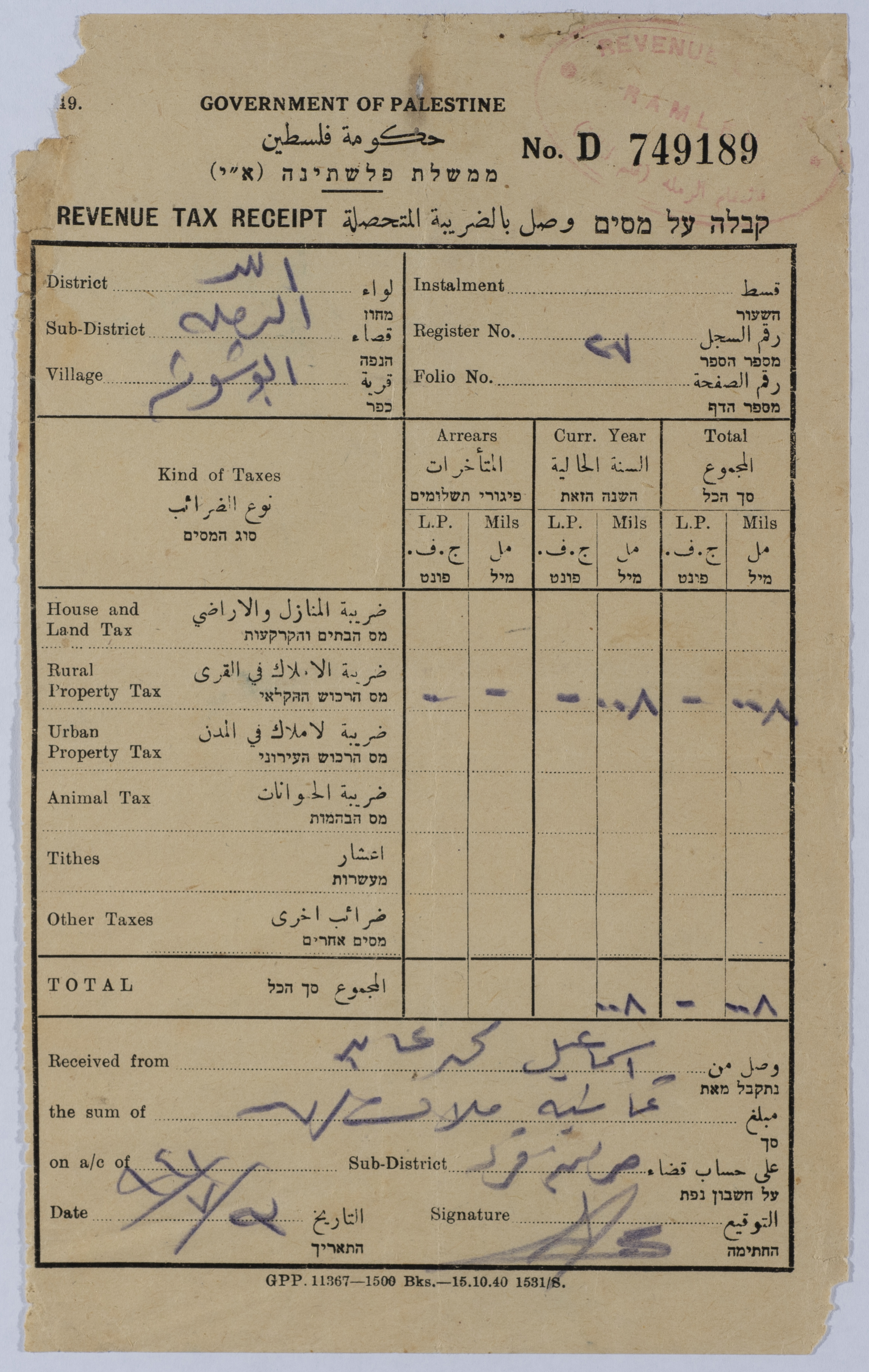 وصل ضريبي بالضريبة المحصلة من حكومة الانتداب البريطاني تابع لقضاء الرملة، في قرية ابو شوشة، باسم: اسماعيل محمد عيد
