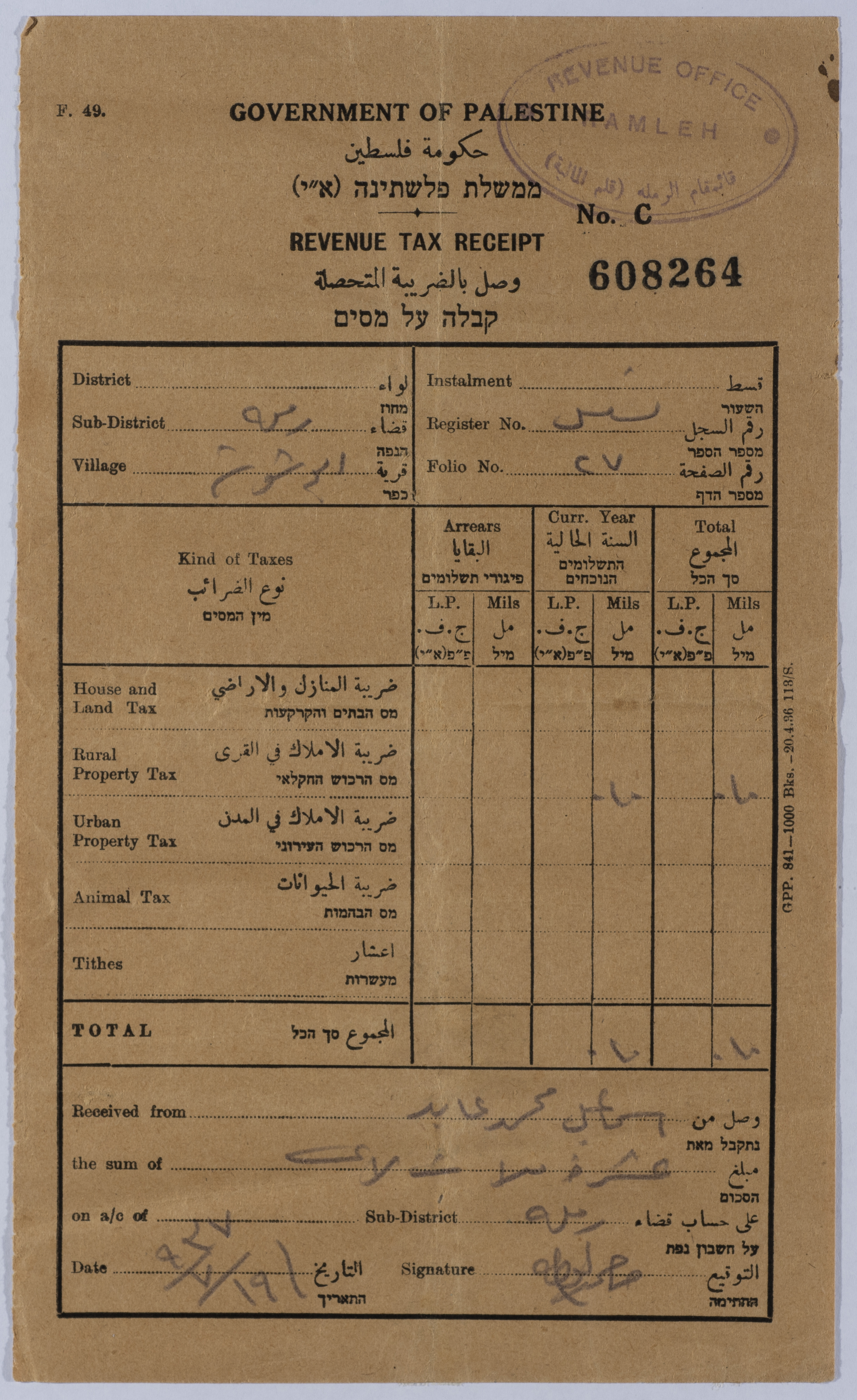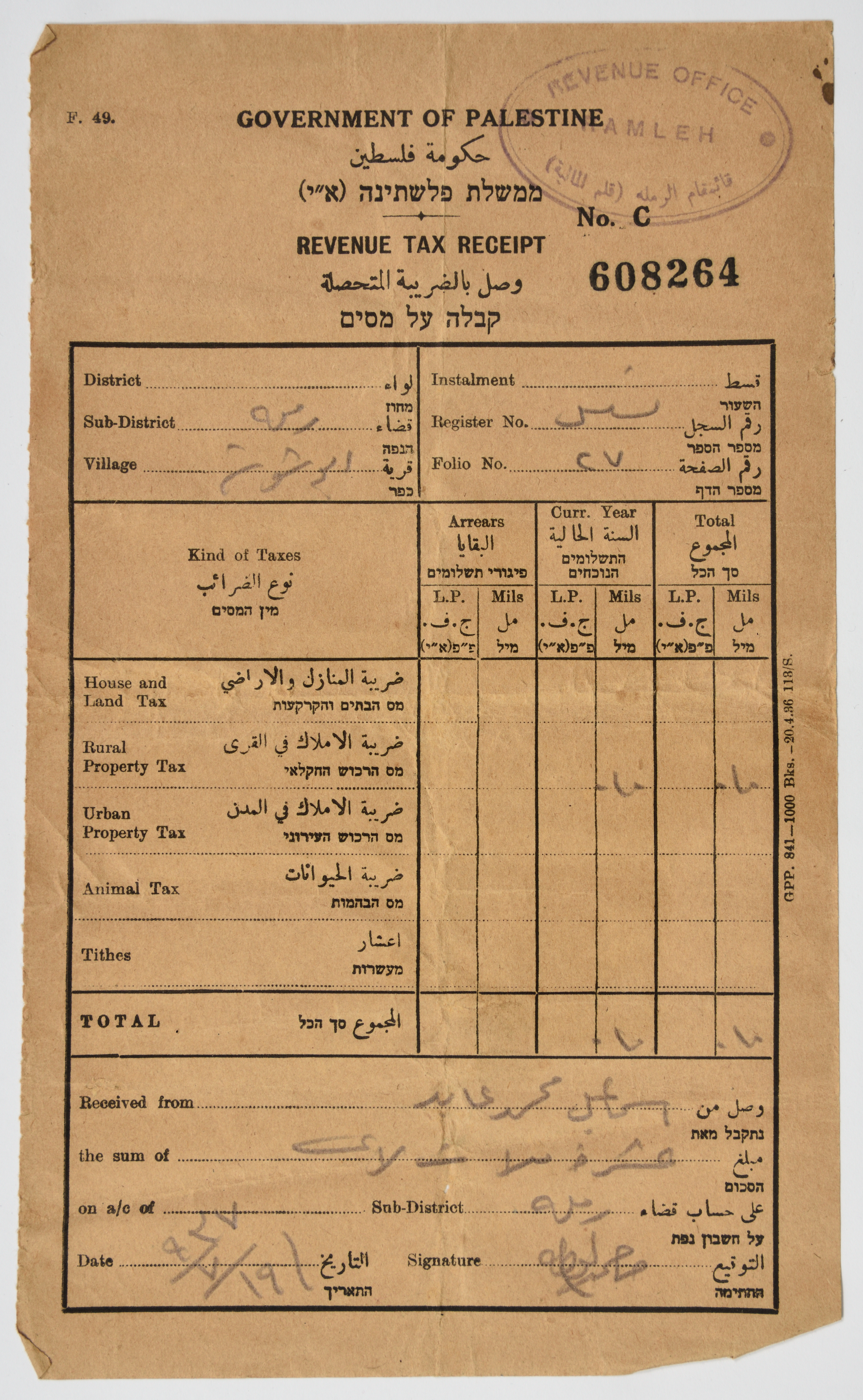 وصل ضريبي من حكومة الانتداب