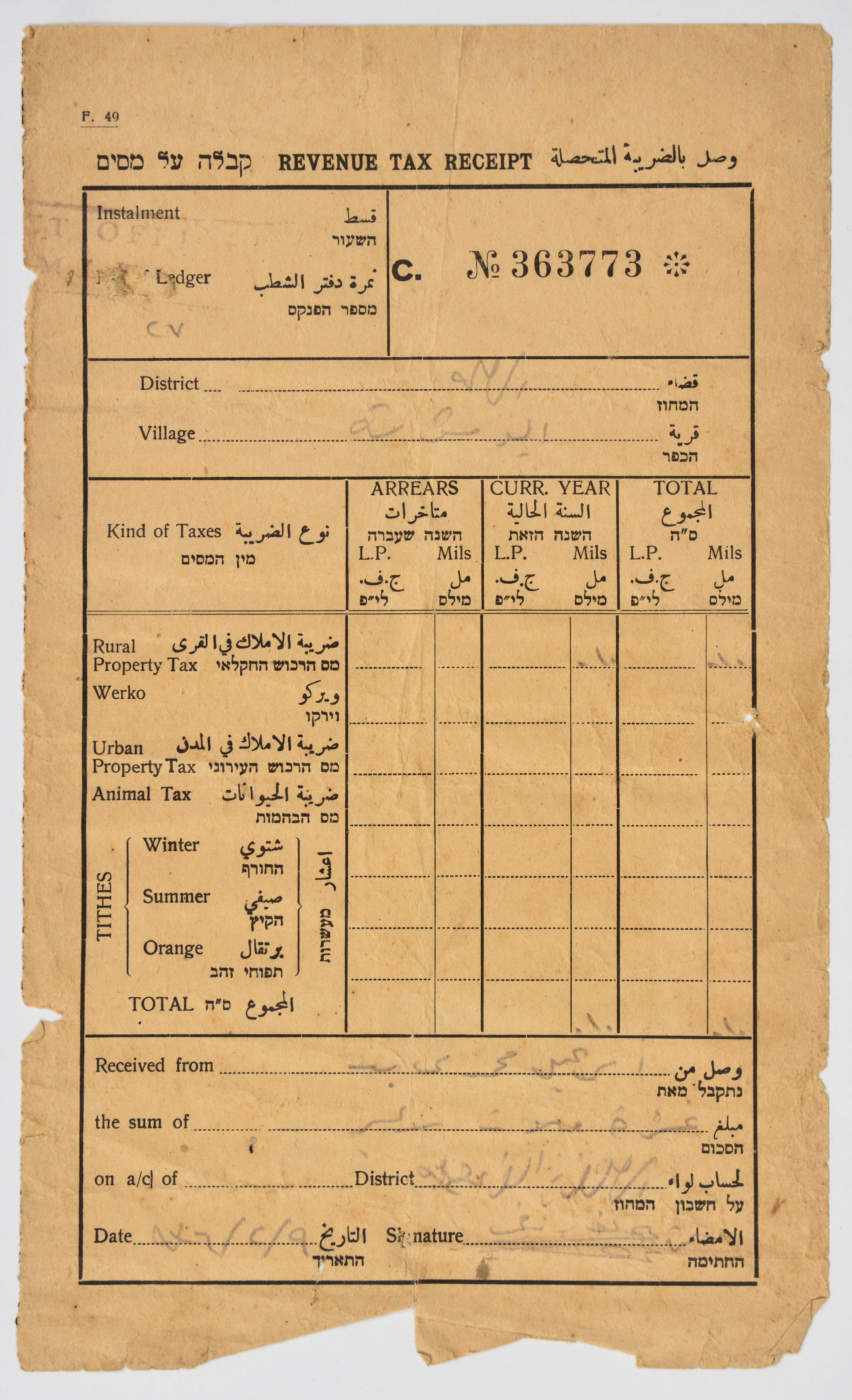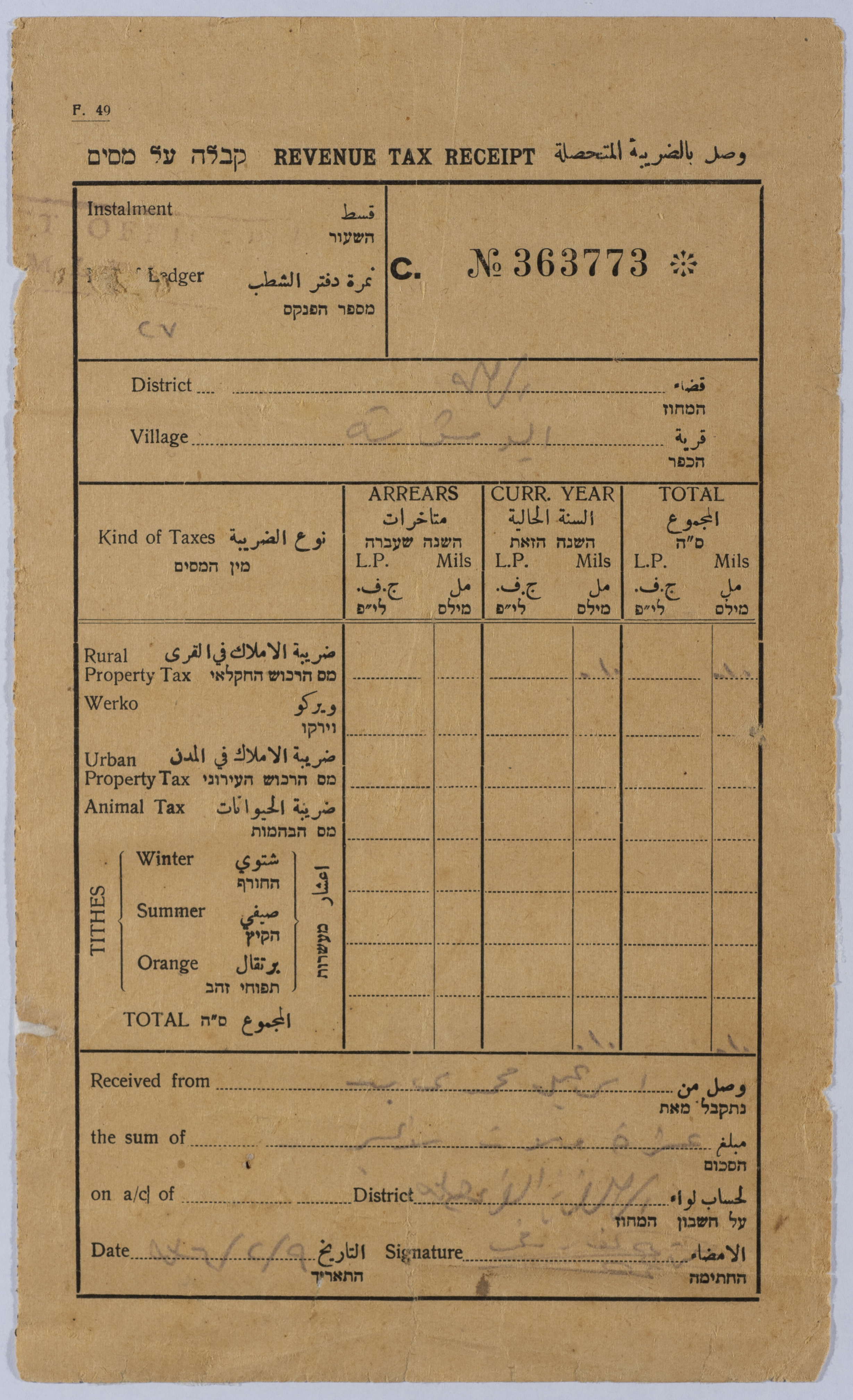 وصل ضريبي من حكومة الانتداب