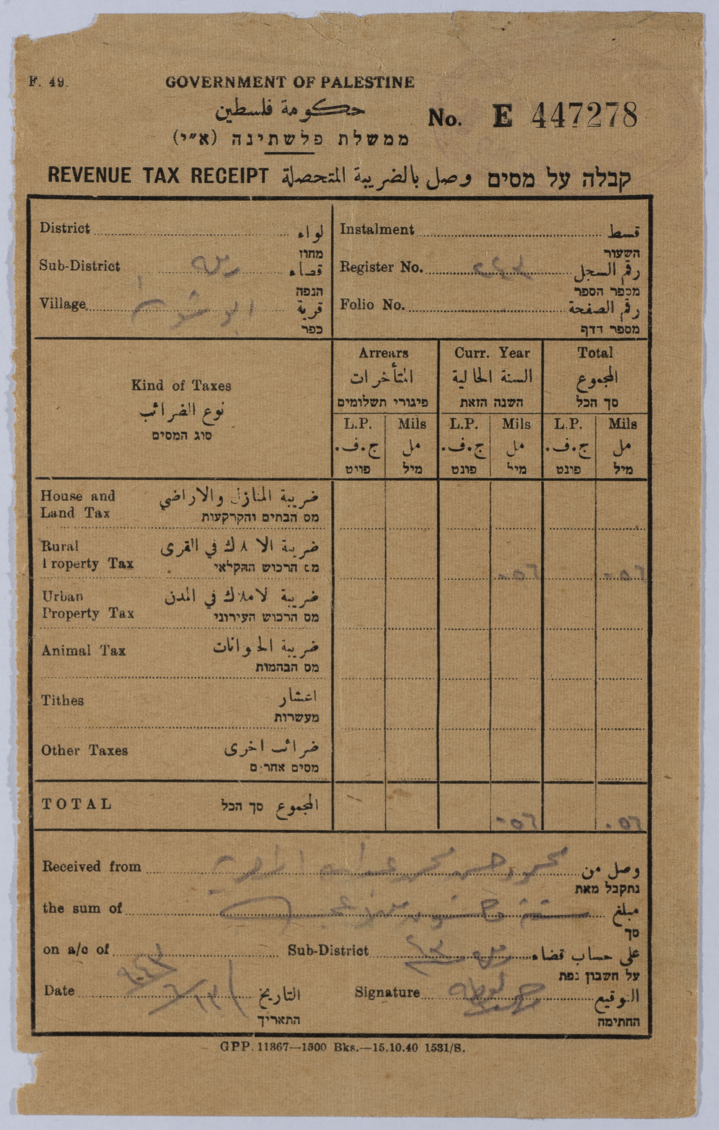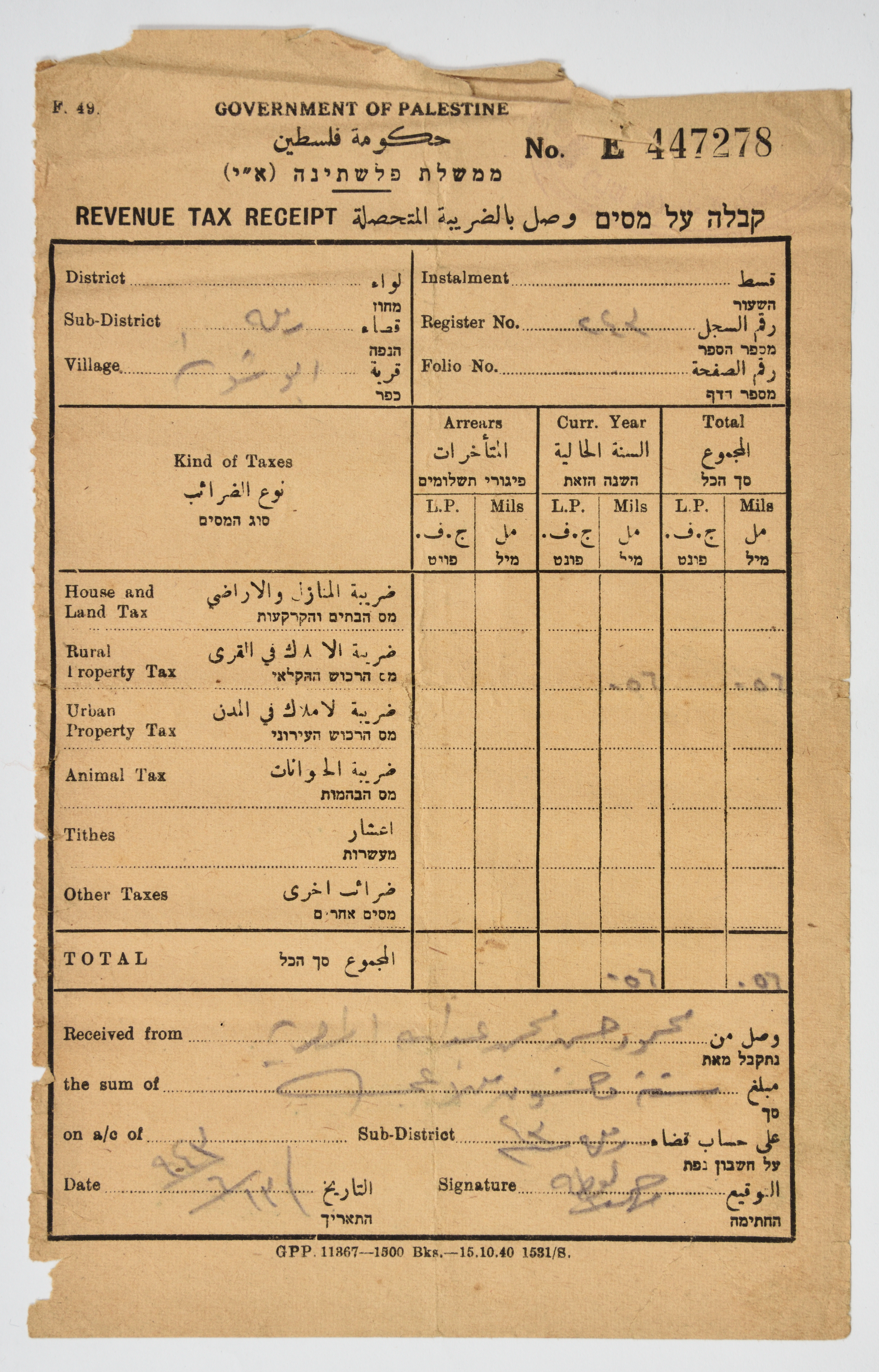 وصل ضريبي من حكومة الانتداب