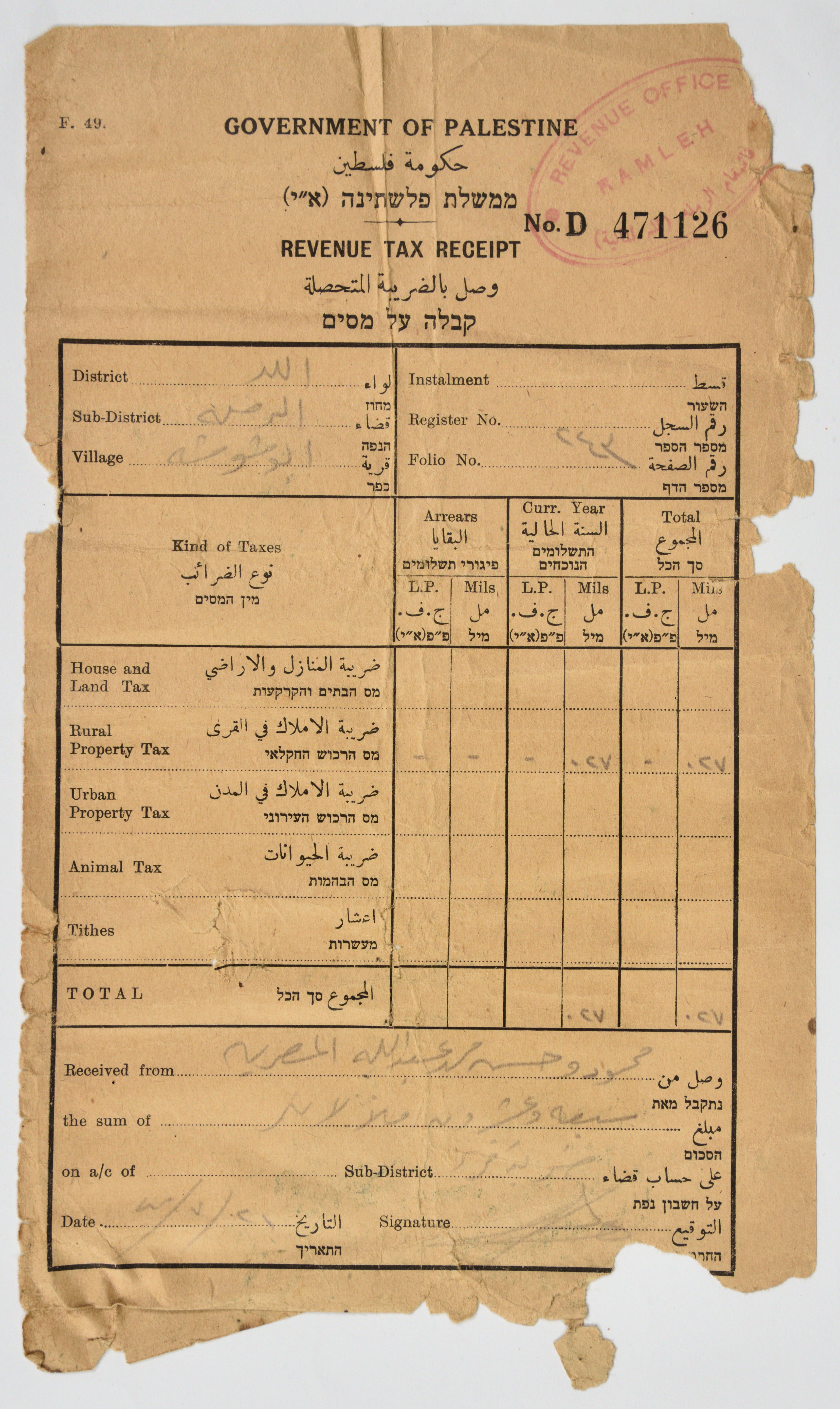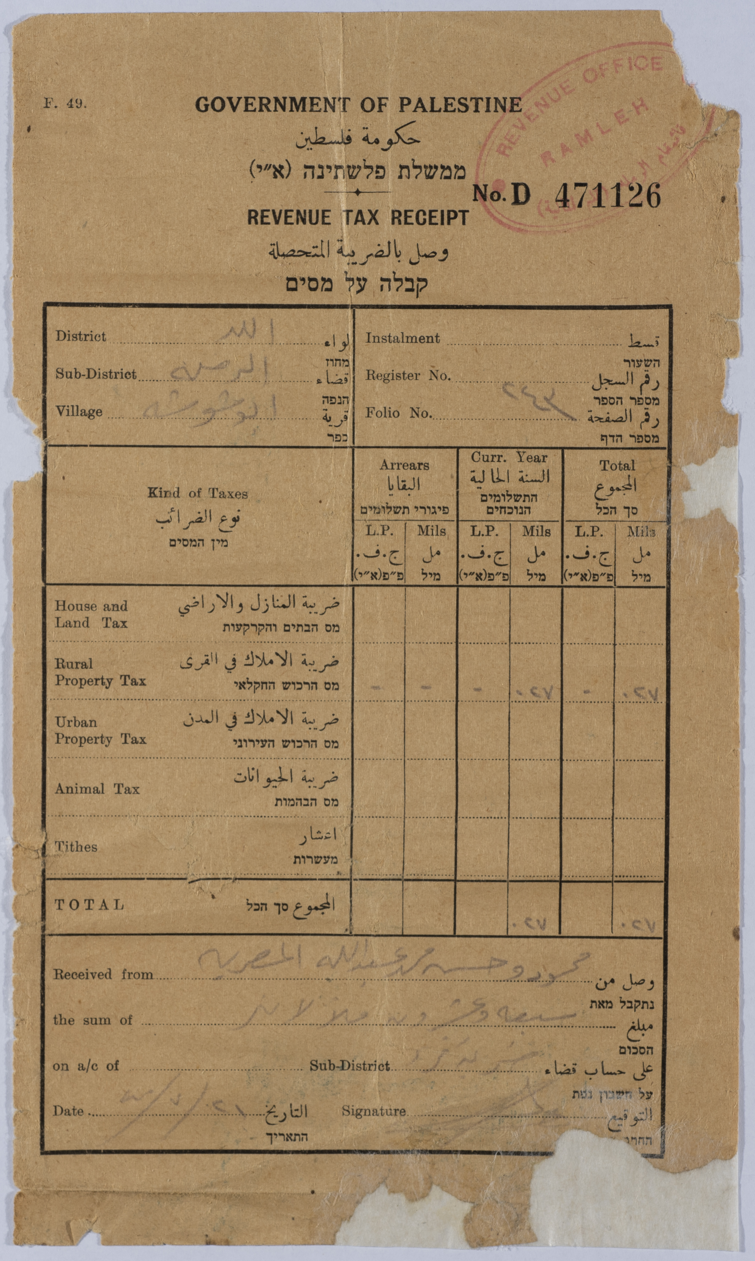 وصل ضريبي بالضريبة المحصلة من حكومة الانتداب البريطاني تابع للواء اللد، قضاء الرملة، في قرية ابو شوشة، باسم : محمود حسن محمد عبدالله المصرية