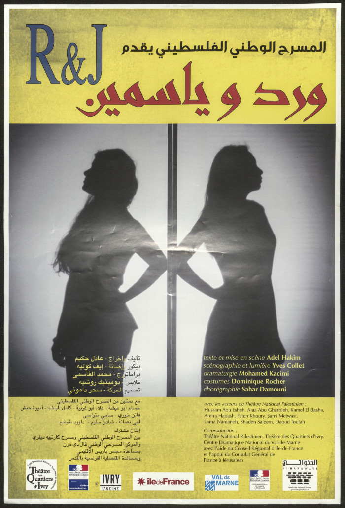 A colour poster published by the Palestinian National Theatre/ El-Hakawati to promote their production "Ward wa Yasmin" [Roses and Jasmine]. The play was co-produced with the Theatre of the Quartiers d'Ivry and the Centre Dramatique National du Val-de-Marne with the help of the French Regional Council and the support of the Consulate General of France in al-Quds. Written and directed by ʿĀdel Hakim, the cast of the play includes Husam Abu Aisha, Alaʾ Abu Arabiyya, Kamel al-Basha, Amira Habash, Faten Khury, Samy Mitwasy, Lama Nuʿmana, Shaden Salim, Dawud Tautah.