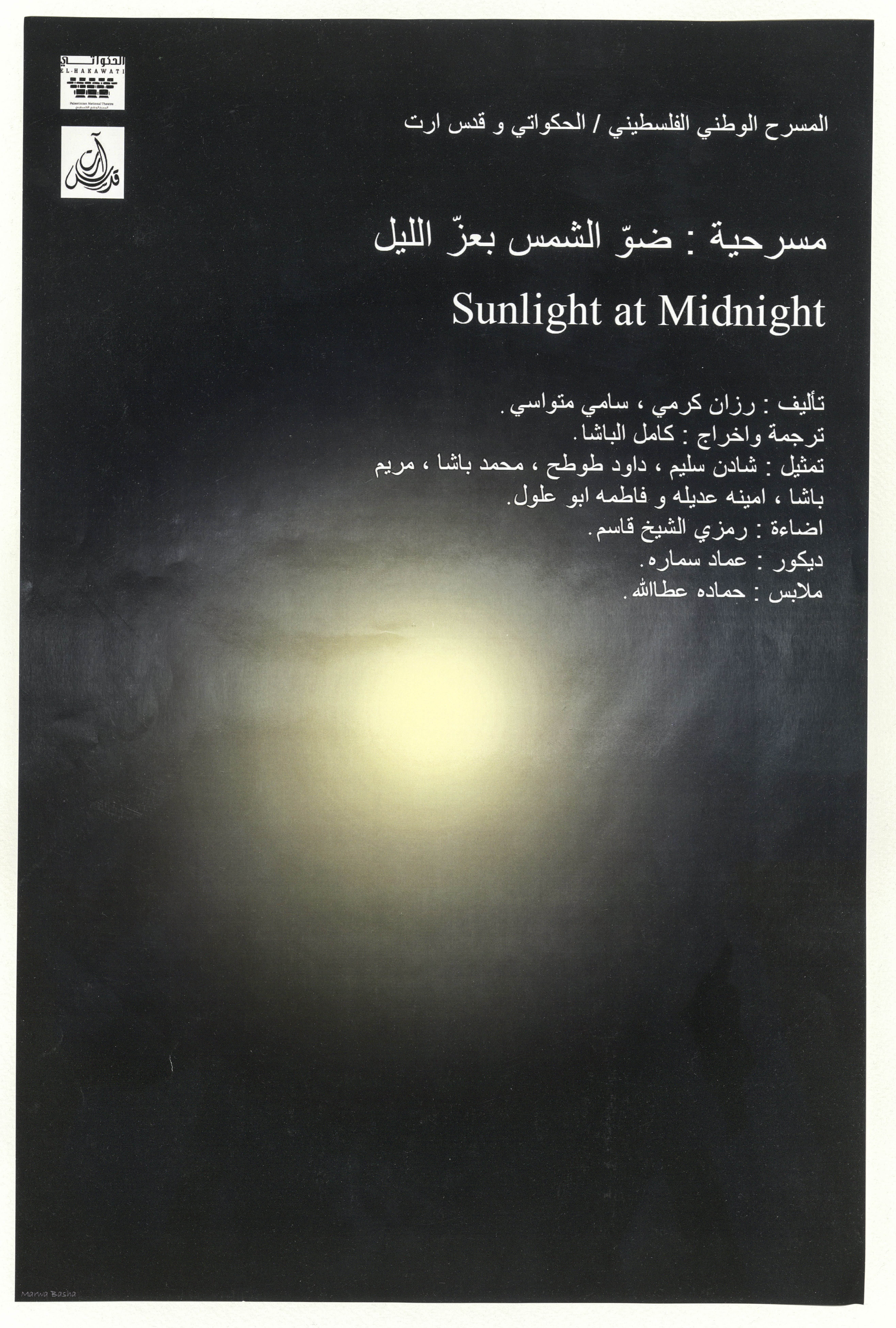 A colour poster published by the Palestinian National Theatre to promote their production "Ḍaww ash-Shams by ʿizz al-Lail" [Sunlight at Midnight] in collaboration with Quds Art. Written by Razan Karmy and Samy Mitwasy, translated and directed by Kamel al-Basha, the play tells the story of two Palestinians refugees, one in Shatila Refugee Camp and the other in London, whose lives converge in one fateful phone call.