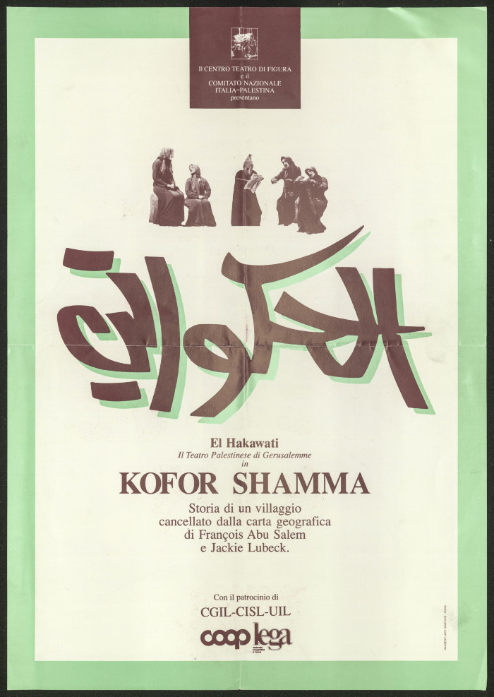 A colour poster published by El-Hakawati Theatre Company to promote their production "Kafr Shamma" in France. Written and directed by François abu Salem and Jackie Lubeck, the play tells the story of the Destroyed Palestinian Villages in 1948 by using the village of Kafr Shamma, an imaginary village located between Lod and Ramla. Touring all over Europe to a huge success, the cast of the play includes ʿĀmer Khalil, Edwar Muʿallem, Iman Aun, Ismaʿil ad-Dabbagh, Jackie Lubeck, Nabil Hajjar, and Imad Miziʿro.
