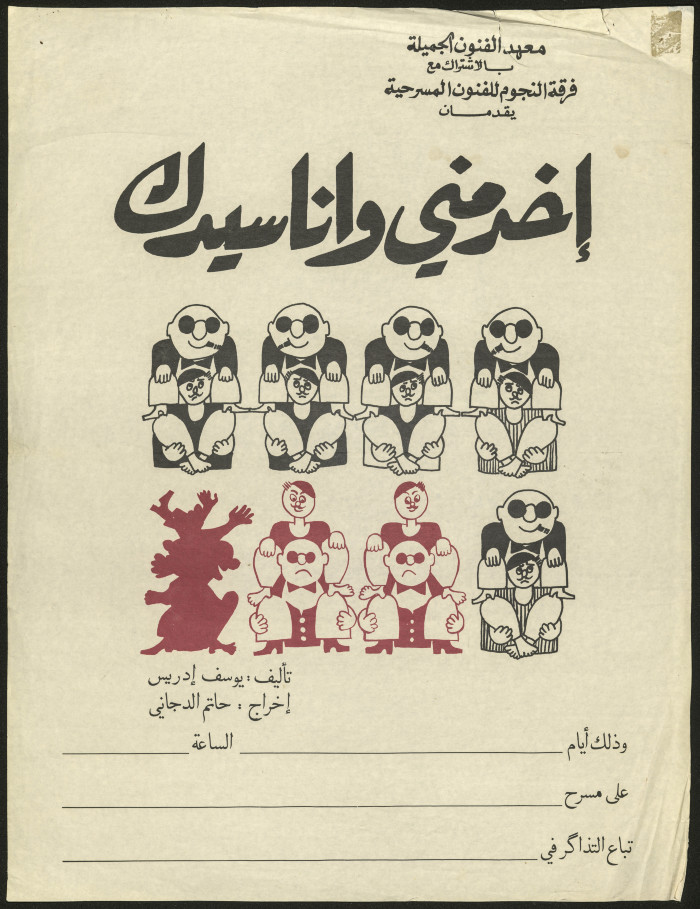 A colour poster published to promote an-Nujum Theatre Troupe's production "Ikhdeminy Wana Sidak" [Serve Me, I am Your Master] in collaboration with the Institute of Fine Arts. Directed by Hatem ad-Dajjany, this play was written by the Egyptian writer Yusef Idris.