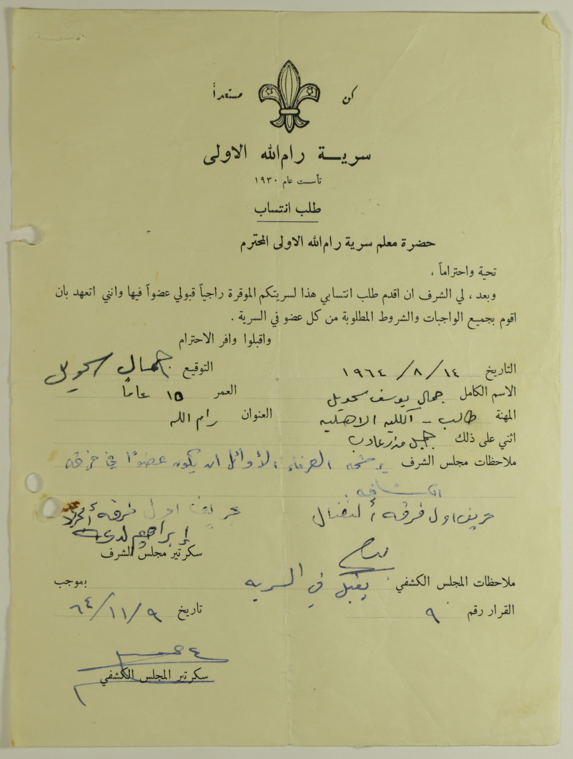 Jamal Sihwail's Membership Application for Sareyyet Ramallah,1964