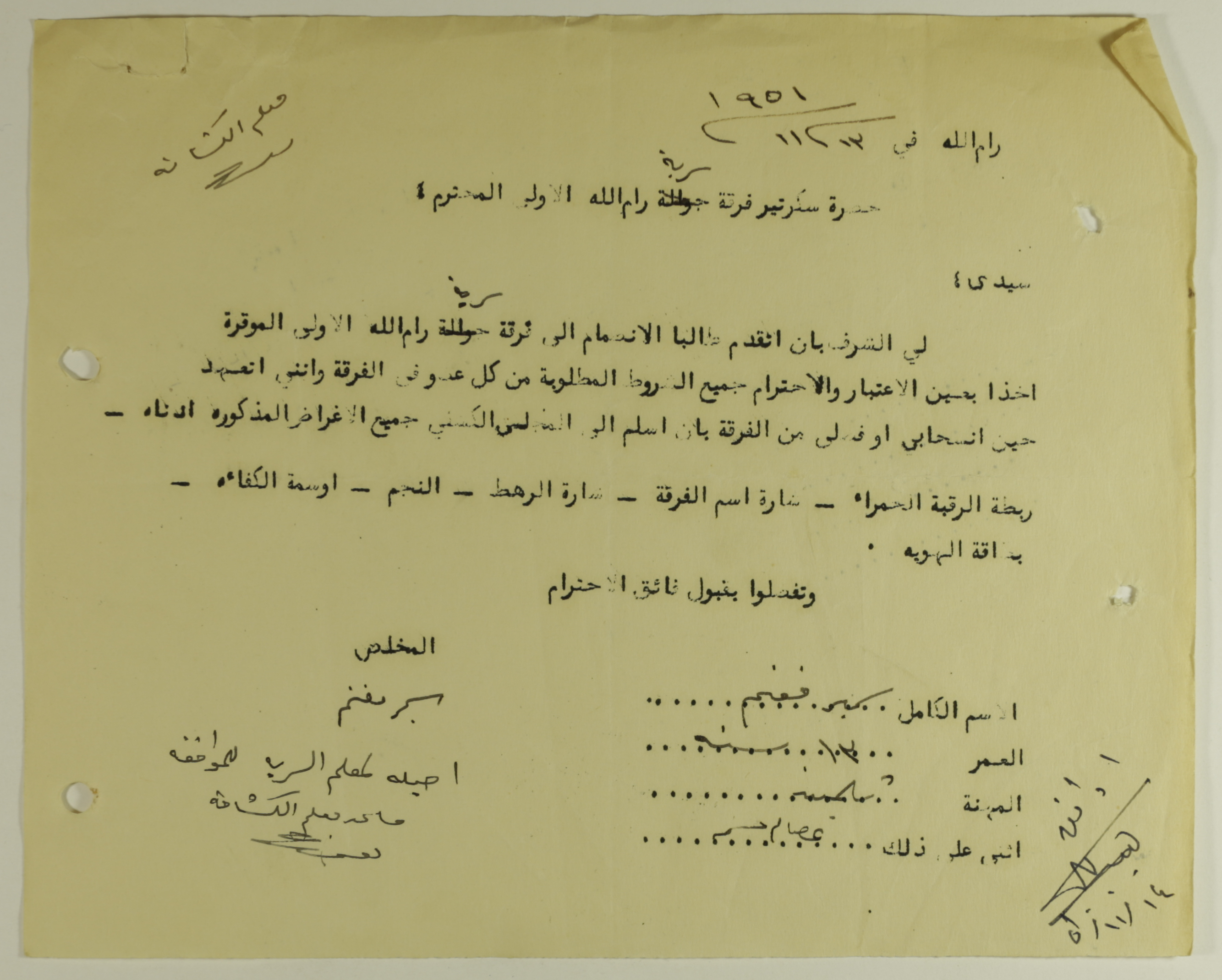 Printed in Arabic, this membership application was submitted by Samir Mghannam in 1951 to join Sareyyet Ramallah pledging to meet all the requirements.