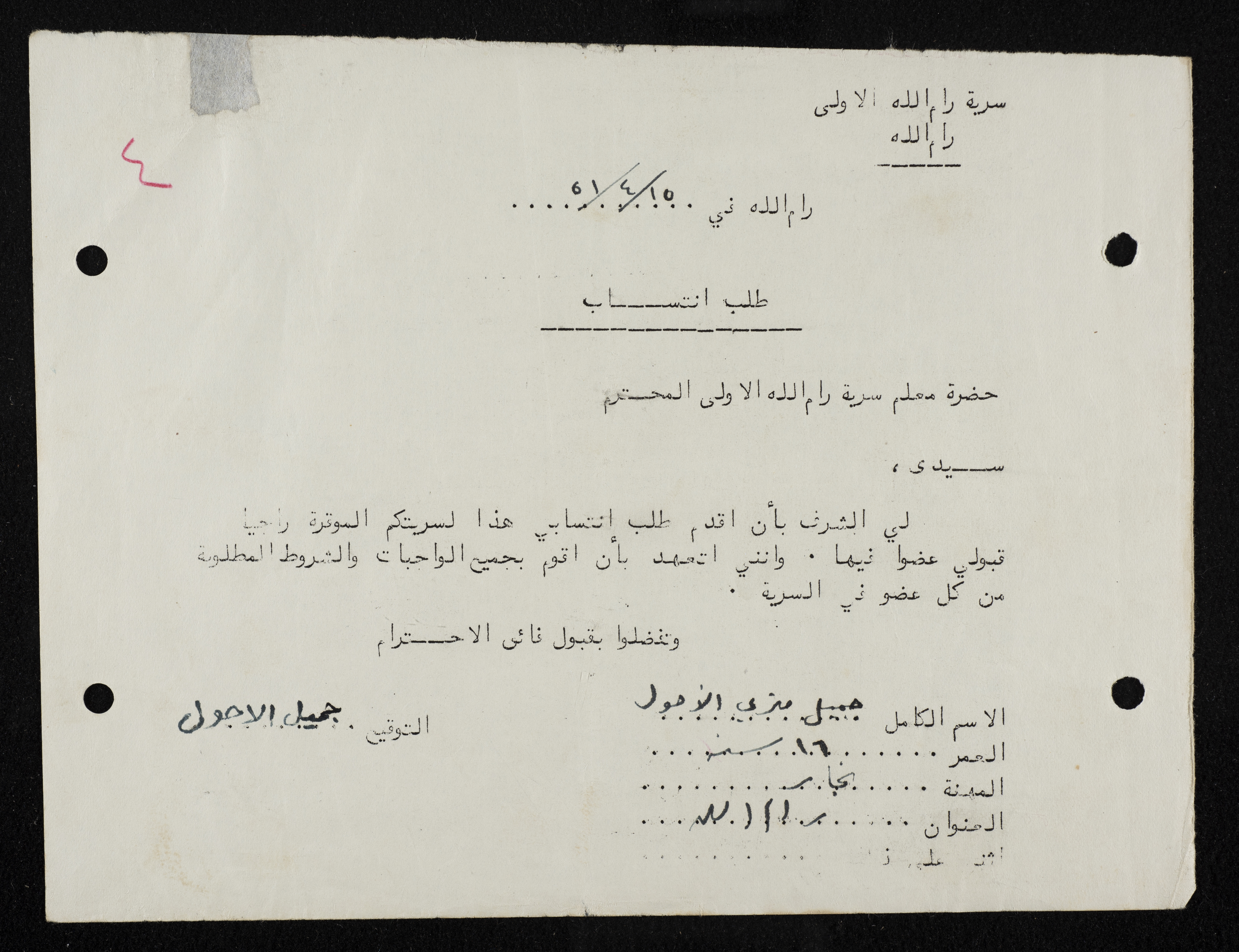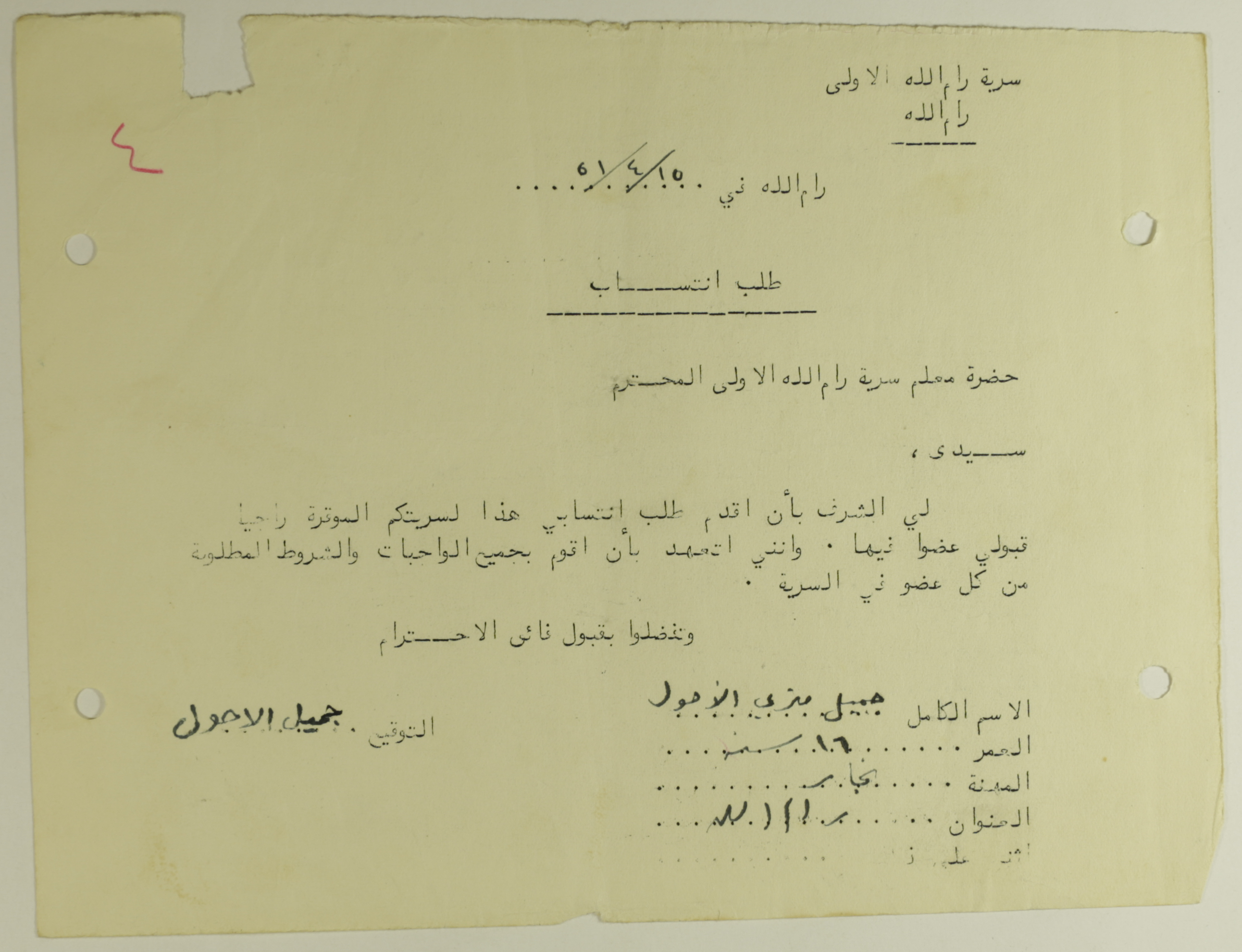 Jamil al-Ahwal's Membership Application for Sareyyet Ramallah,1951