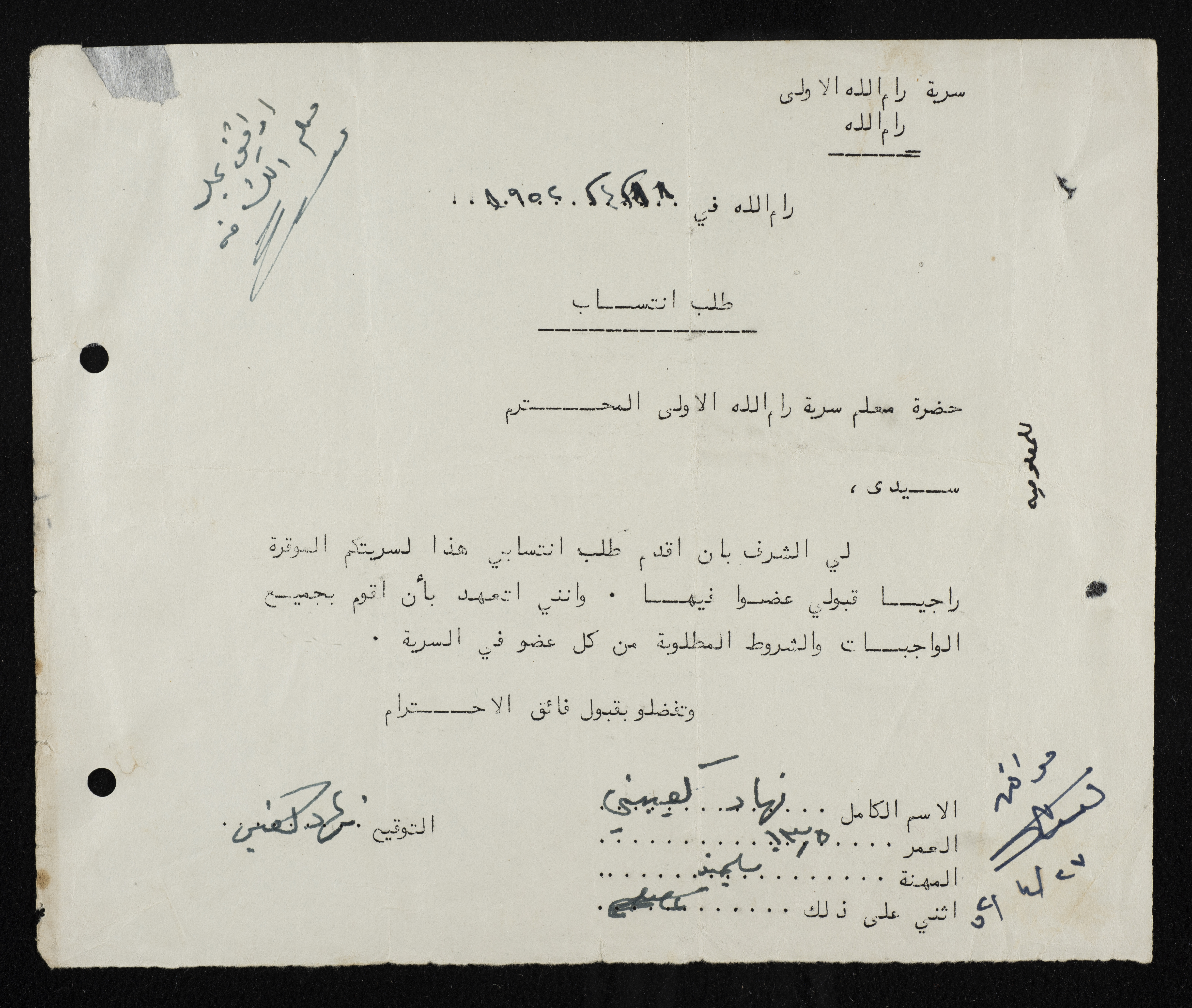 طلب انتساب الى سرية رام الله الاولى عام 1952