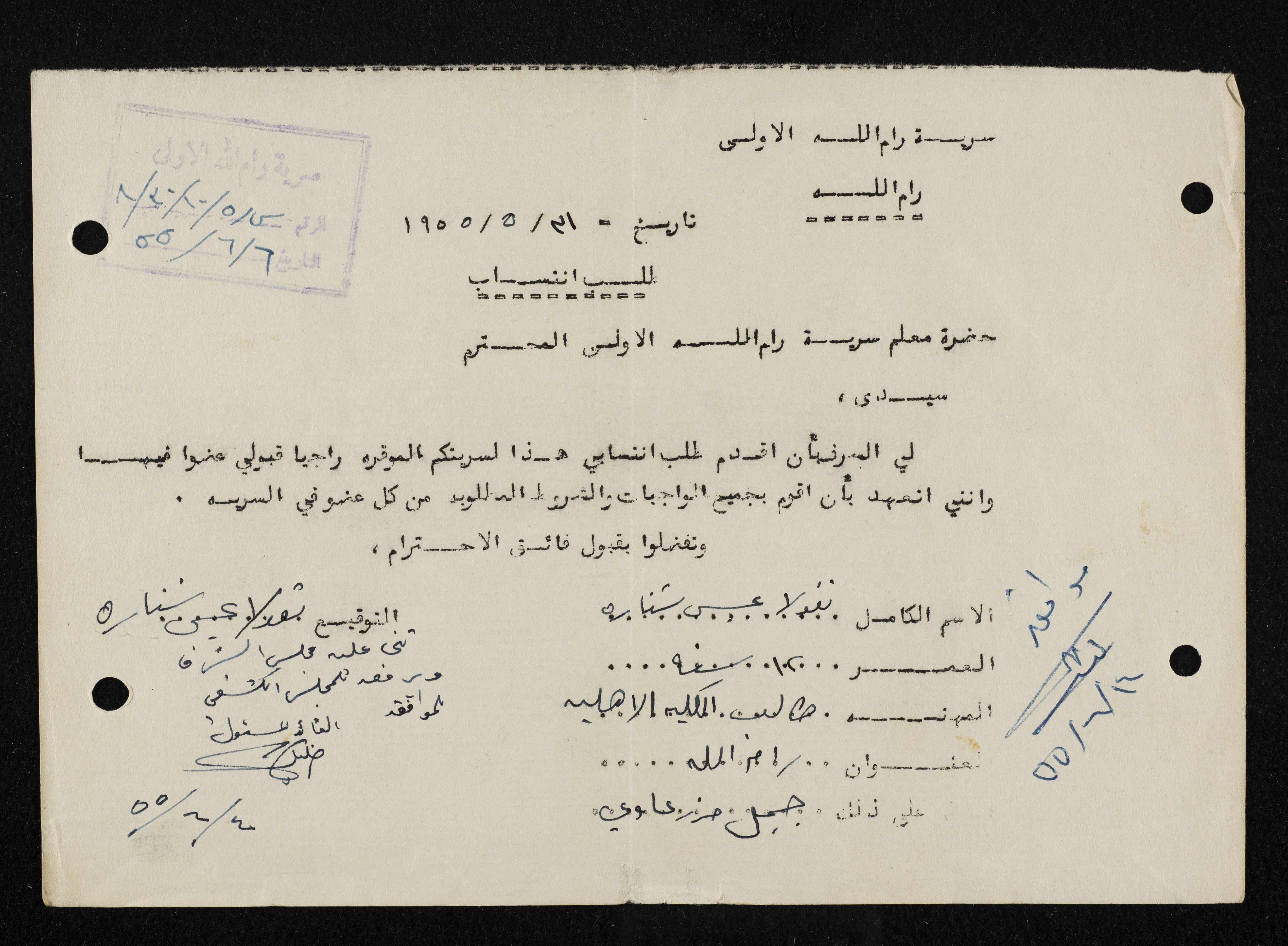 Printed in Arabic, this membership application was submitted by Nicola Shinnara in 1955 to join Sareyyet Ramallah pledging to meet all the requirements.