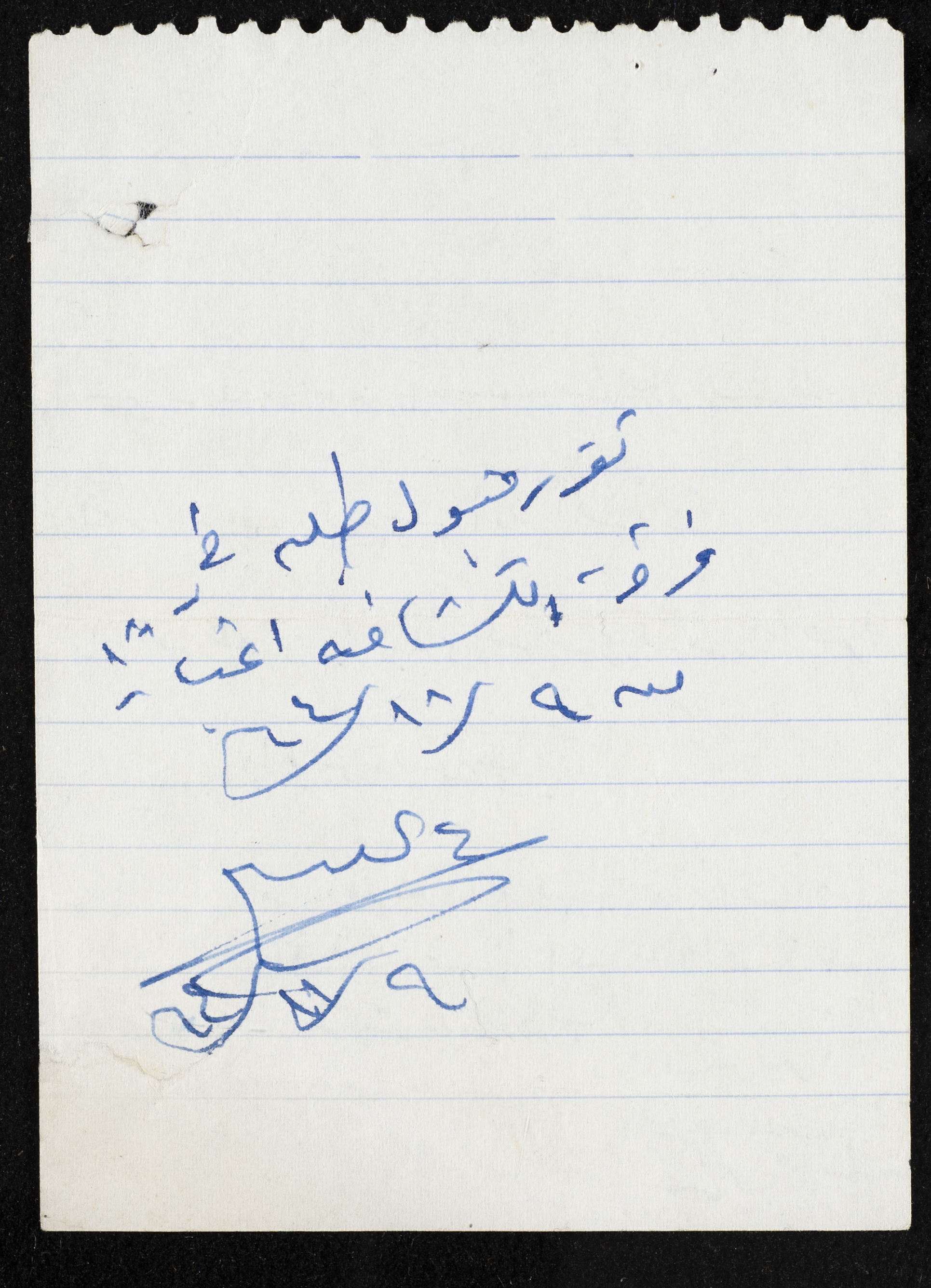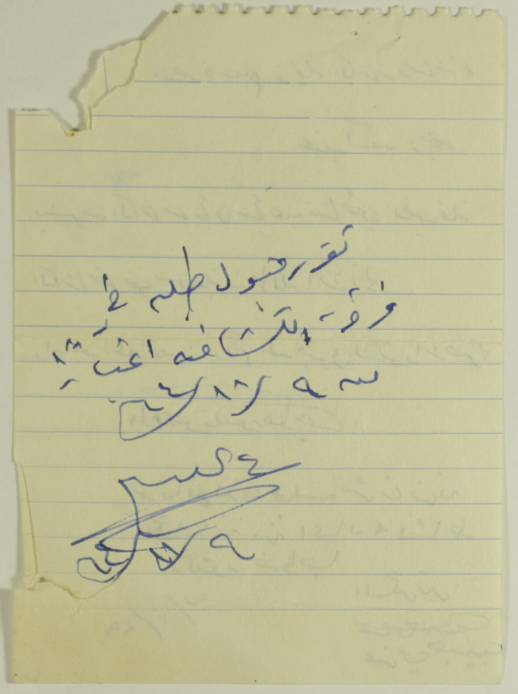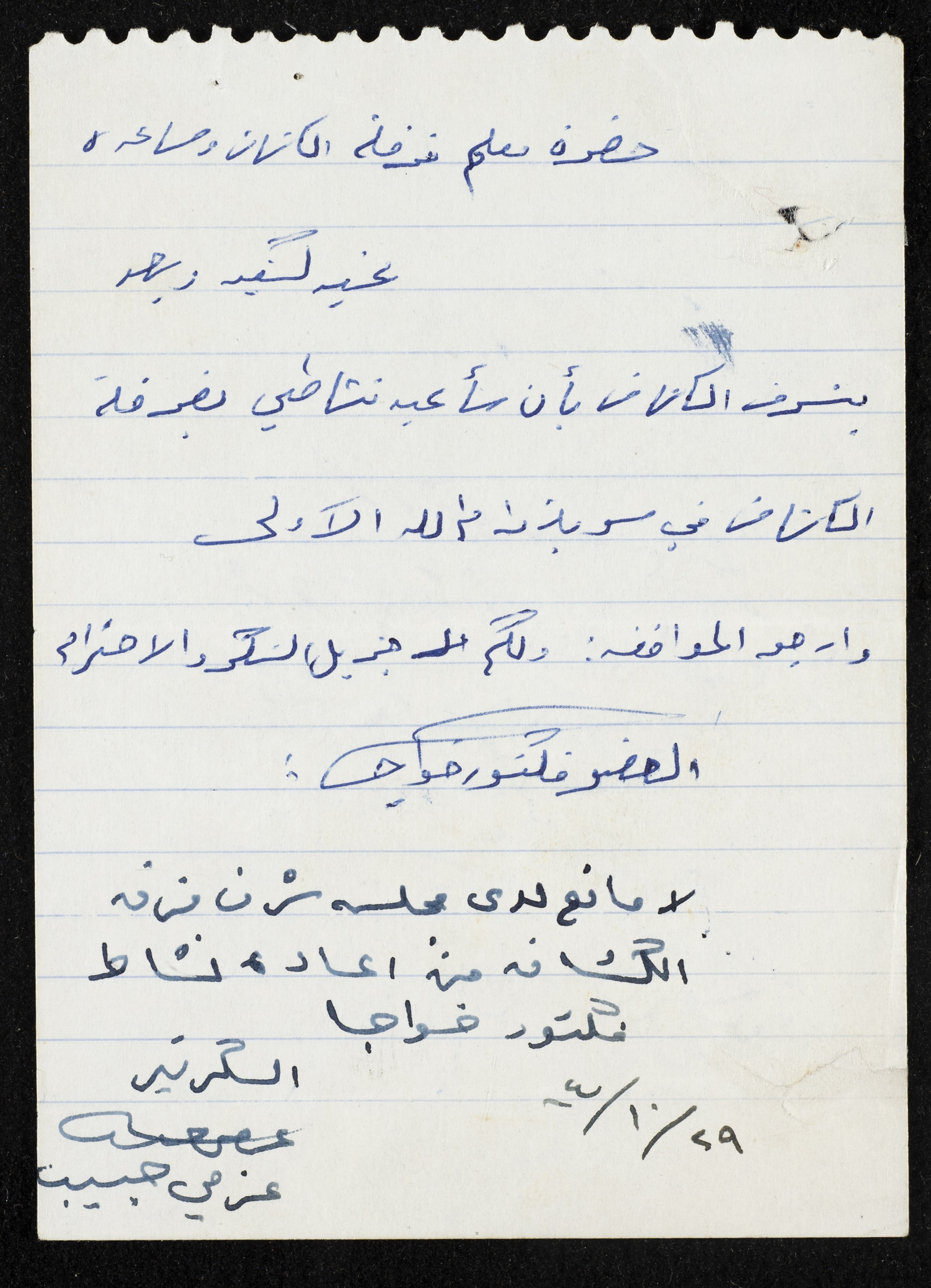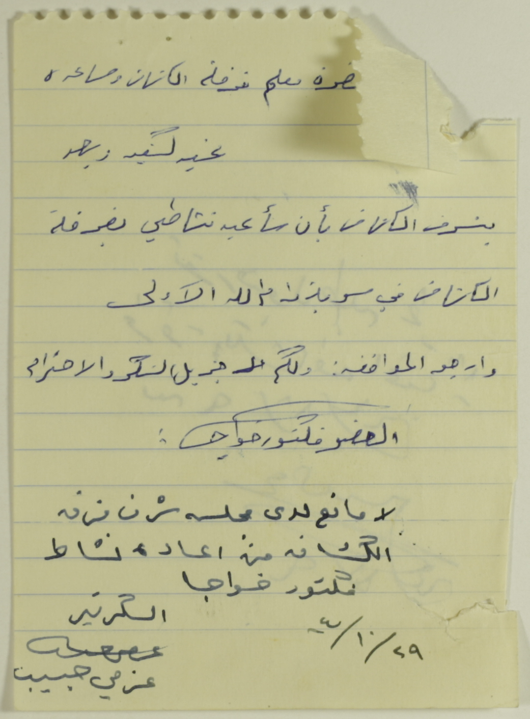 توثق هذه القصاصة الورقية رسالتين؛ الاولى طلب من فكتور خواجا، أحد أعضاء فرقة الكشافة في سرية رام الله الأولى، الموافقة على إعادة نشاطه في الفرقة. فيما توثق الرسالة الثانية موافقة مجلس شرف فرقة الكشافة موقعة بإسم عزمي حبيب، سكرتير فرقة الكشافة.