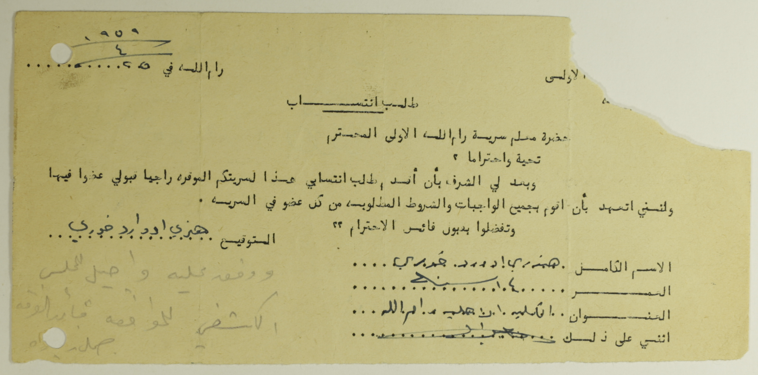 طلب انتساب الى سرية رام الله الاولى عام 1959