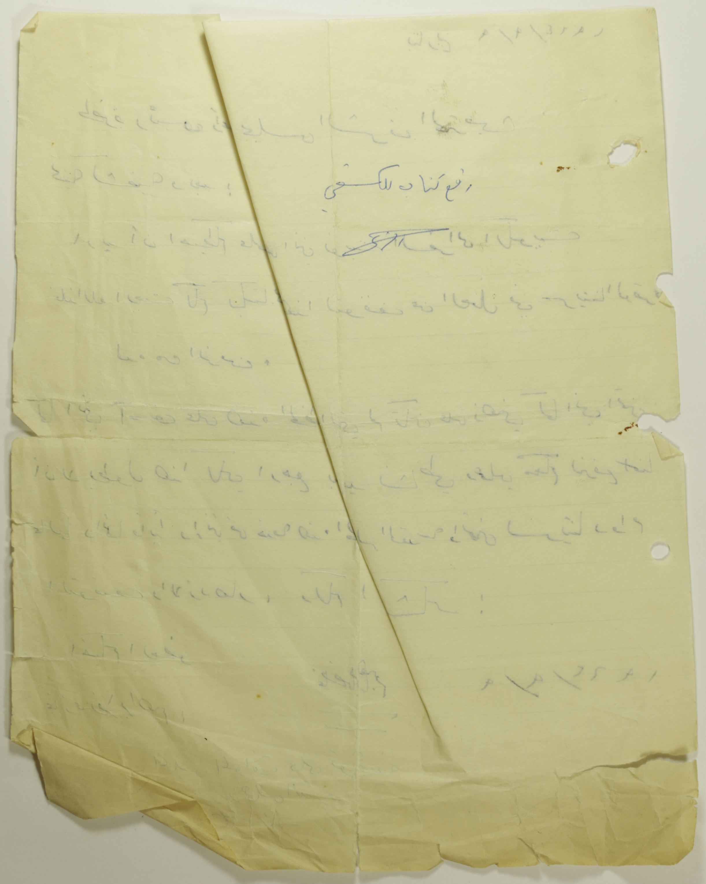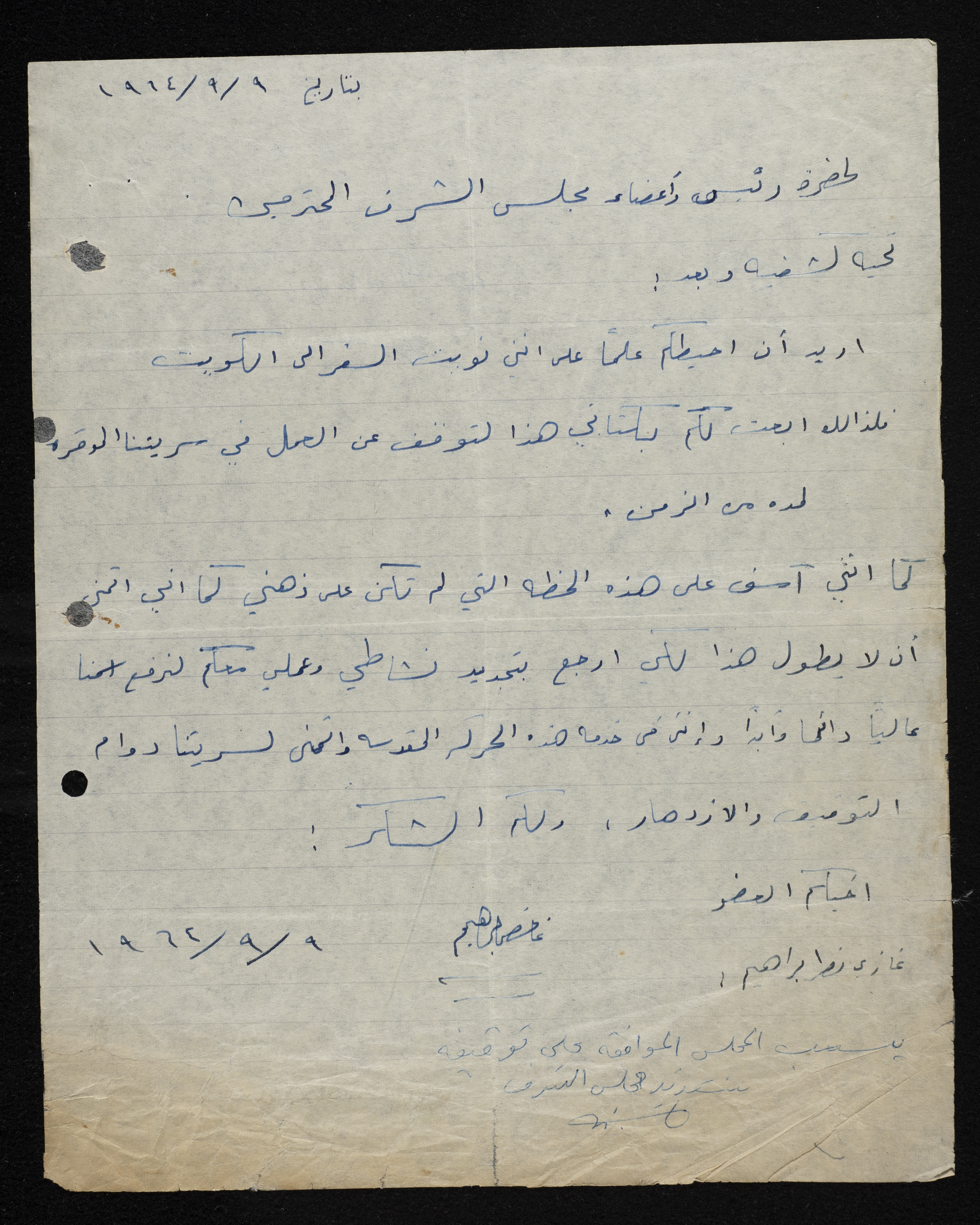 وثيقة مكتوبة باللغة العربية، تتضمن رسالة من غازي ابراهيم الى رئيس واعضاء مجلس الشرف حول تقديم استقاله لانه يريد السفر الى الكويت عام 1964