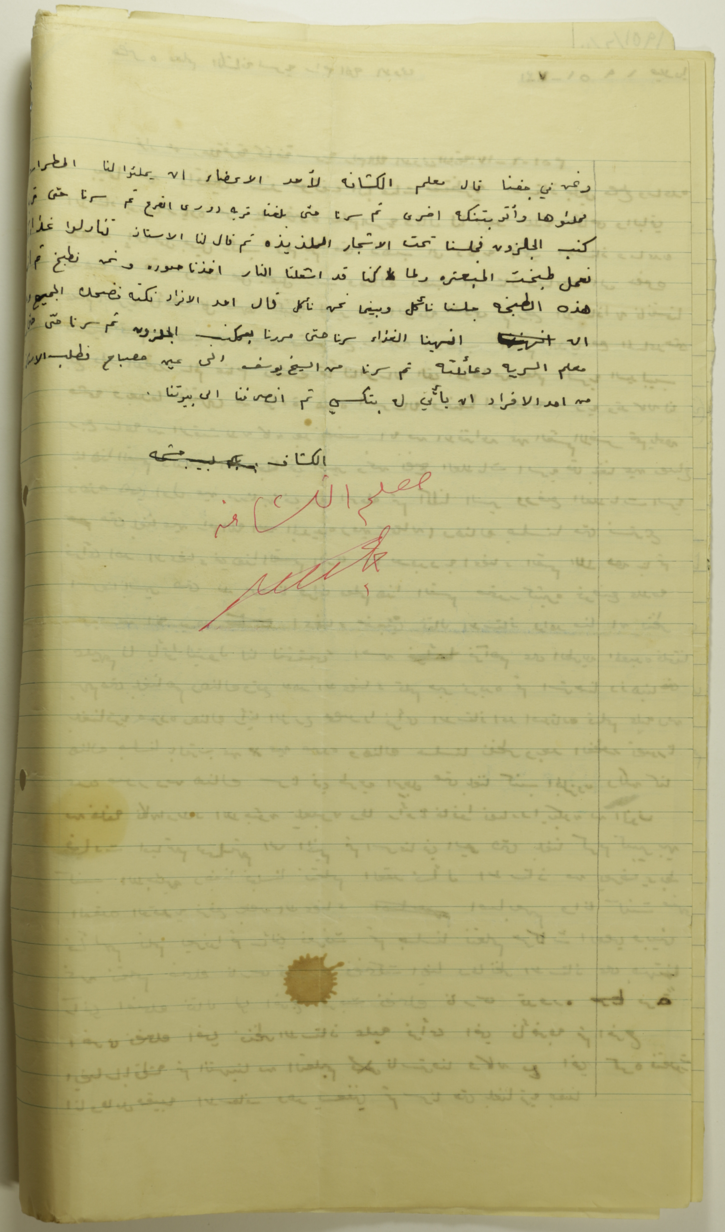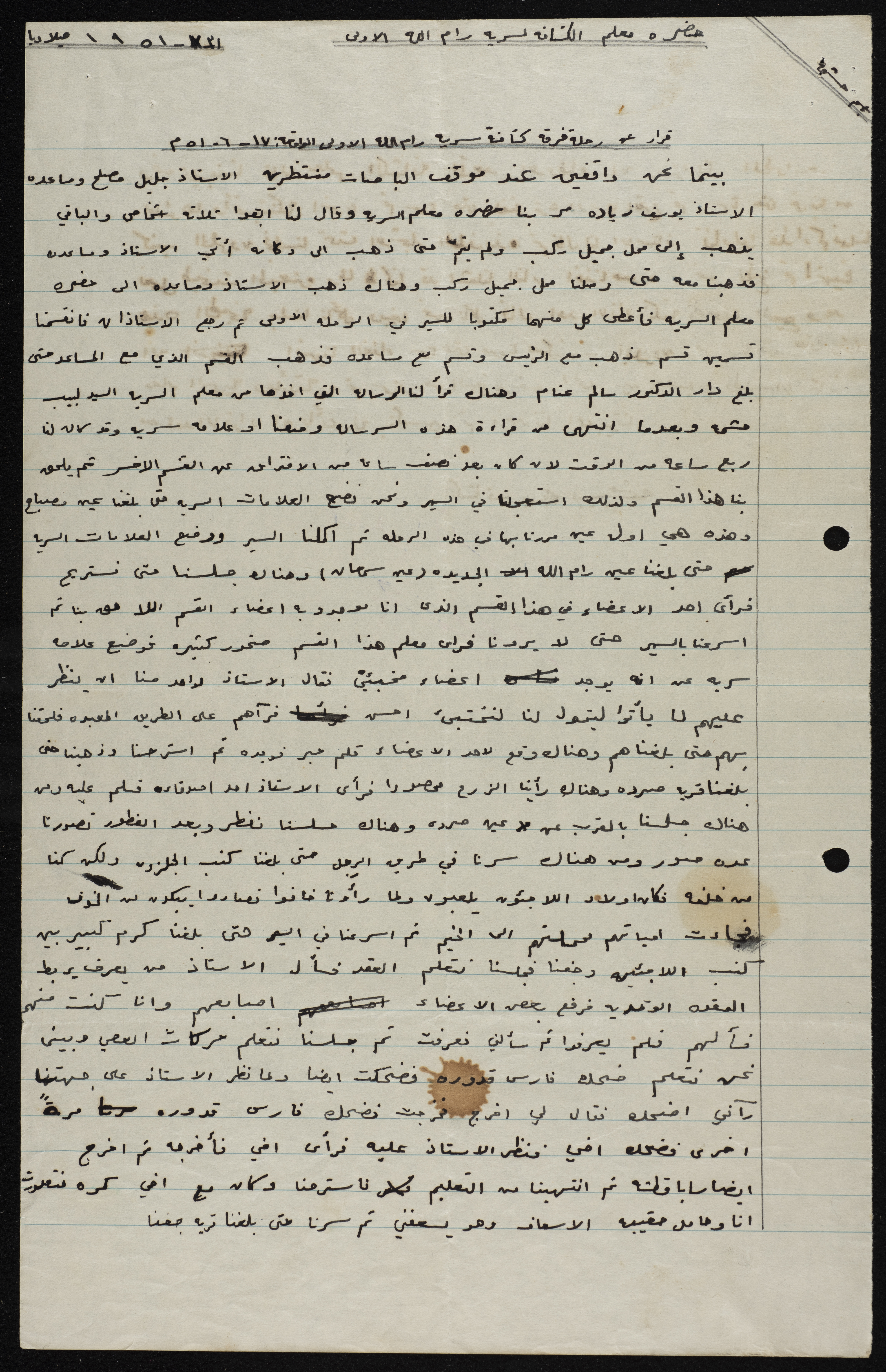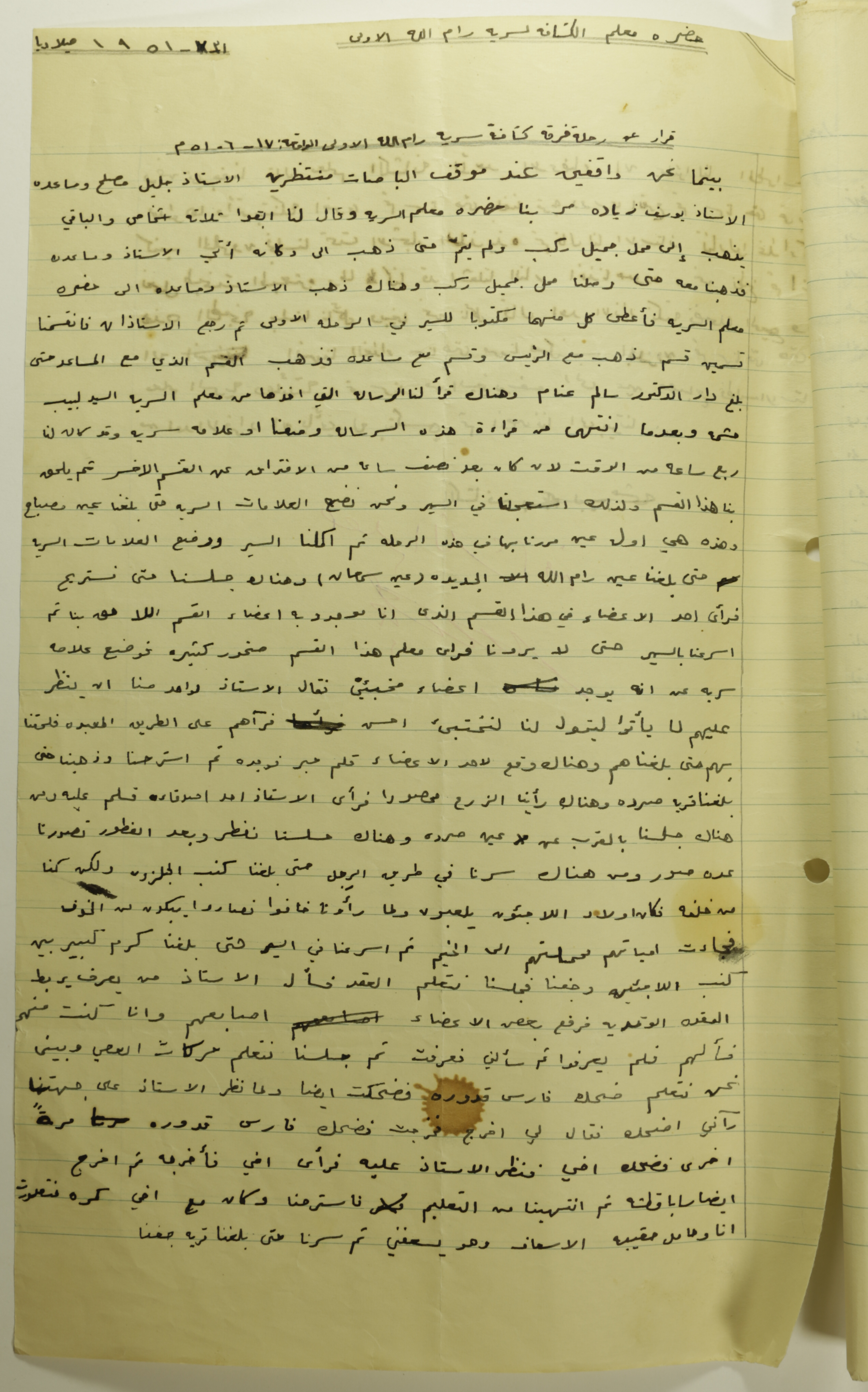 Handwritten in Arabic, this report is on Sareyyet Ramallah's field trip to Ein Musbah and Ramallah on June 17, 1951.