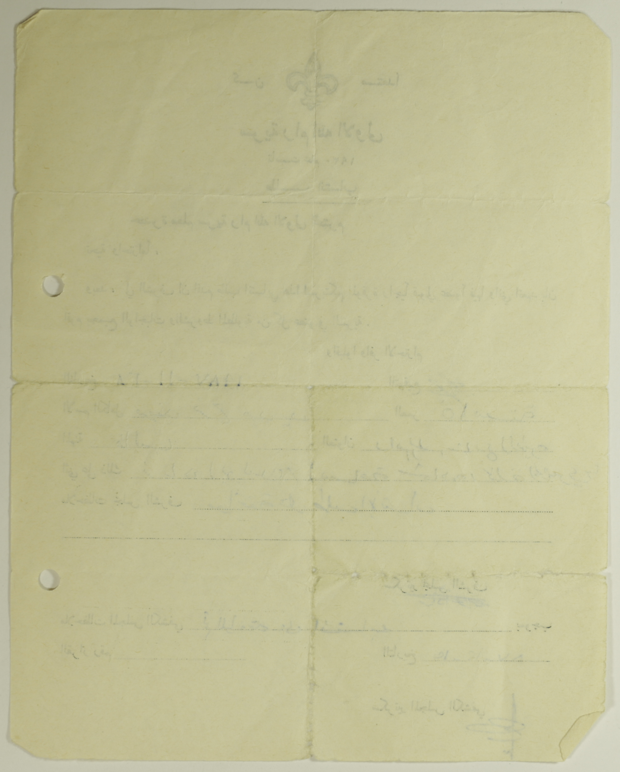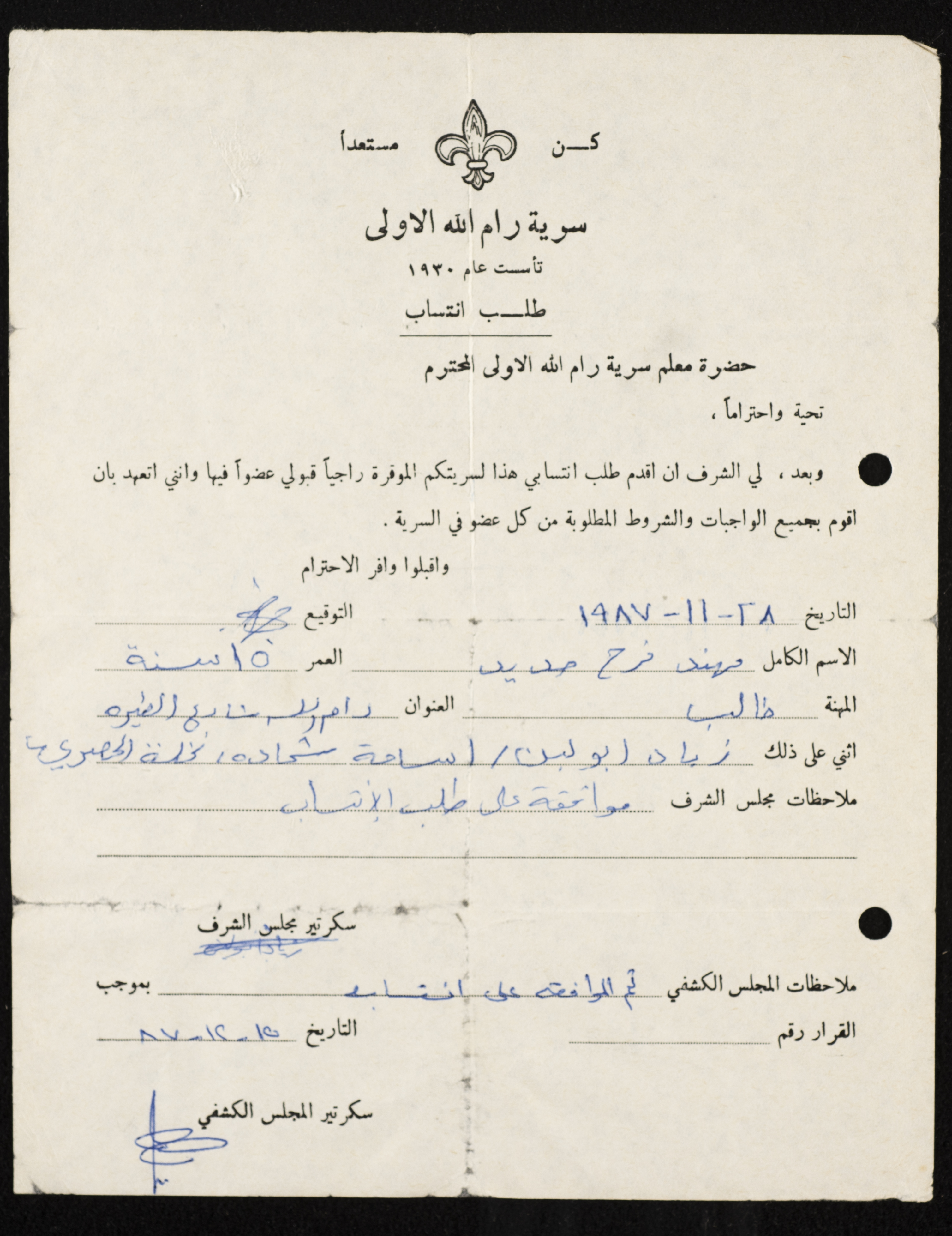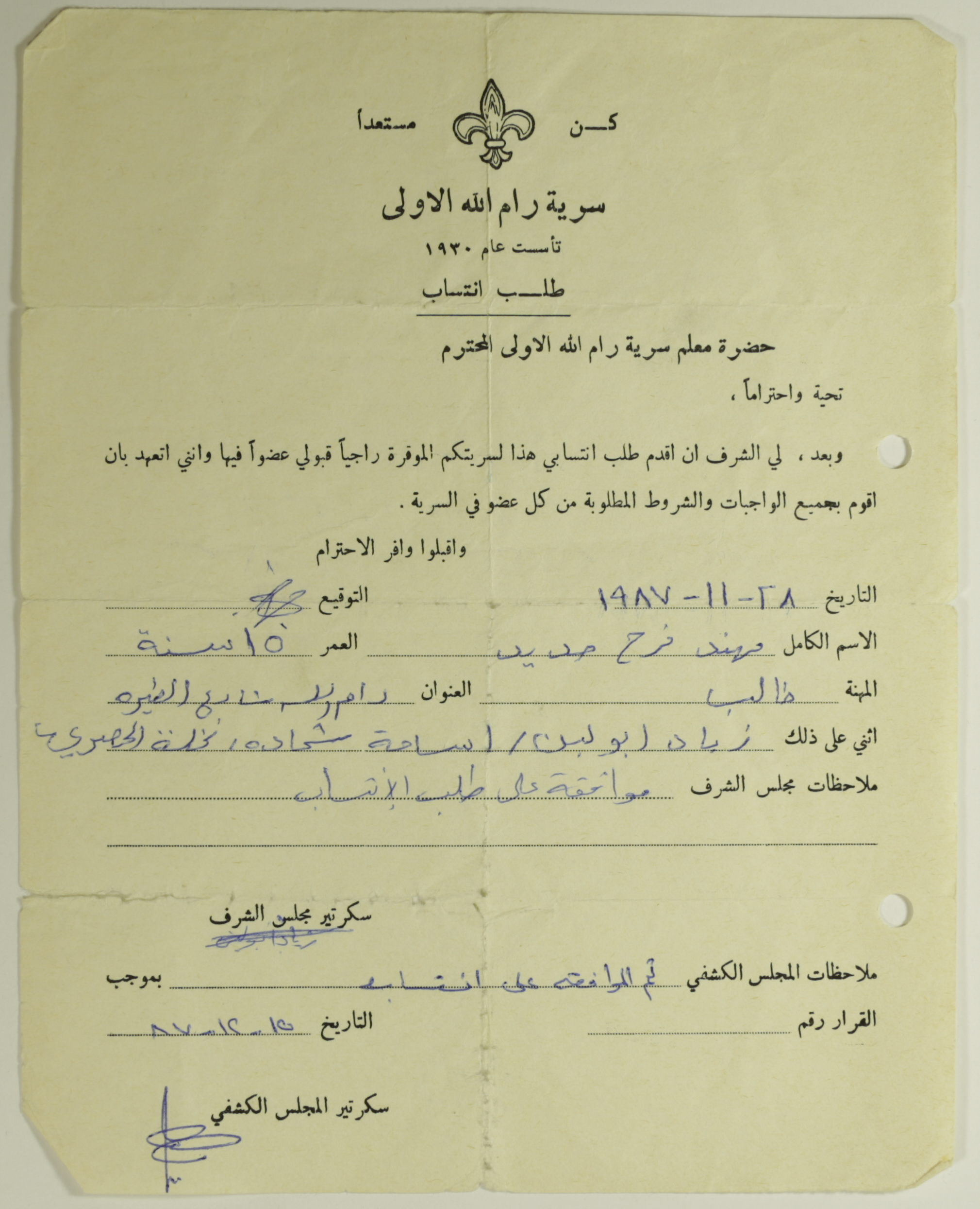 Printed in Arabic, this membership application was submitted by Muhannad Farah Hadid in 1987 to join Sareyyet Ramallah pledging to meet all the requirements.
